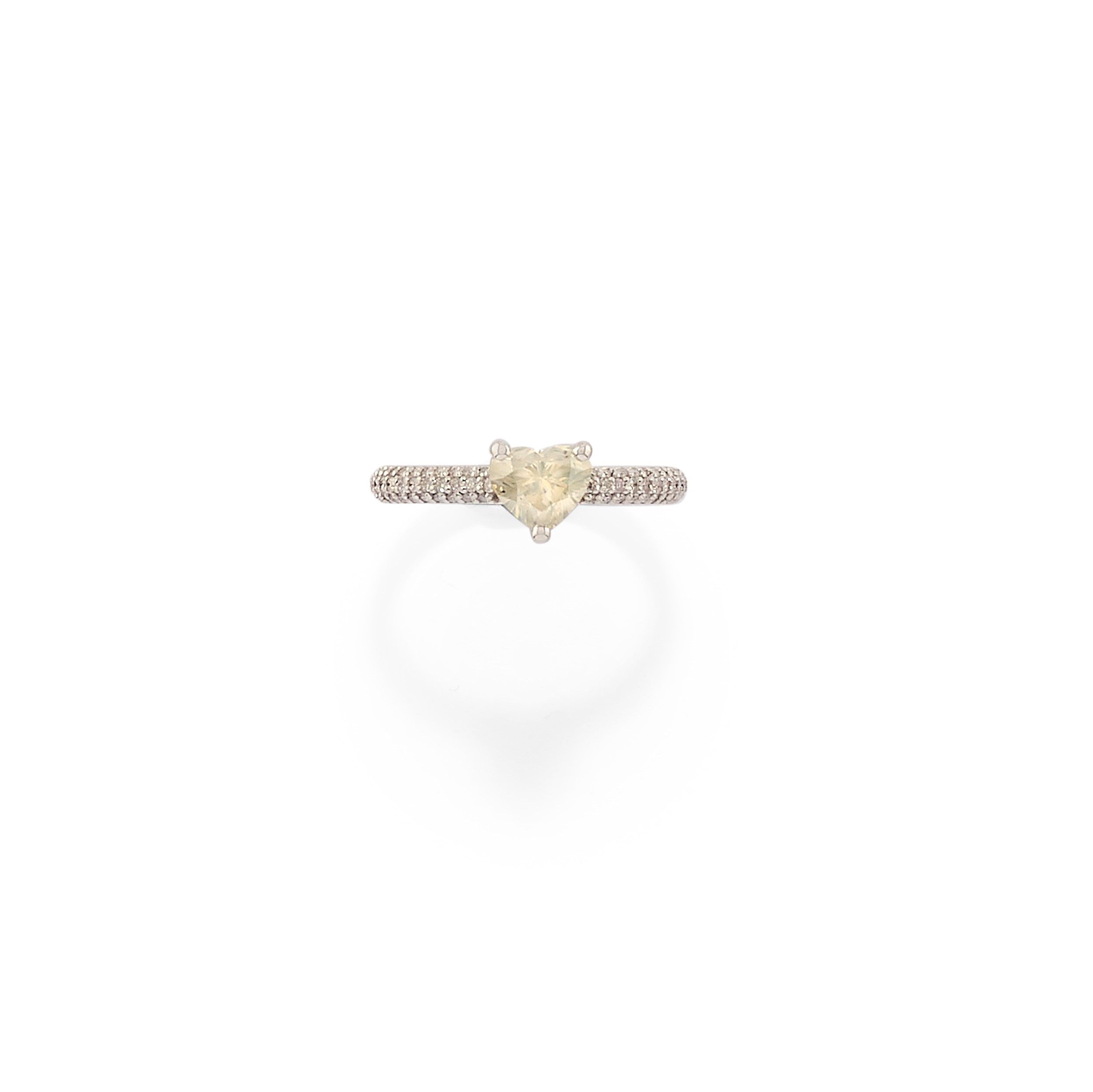 al centro diamante fancy light yellowish gray taglio cuore di ct 1,00, purezza SI1, contorno in diamanti taglio brillante per totale ct 0,23, colore E/G, purezza VS2/SI2.