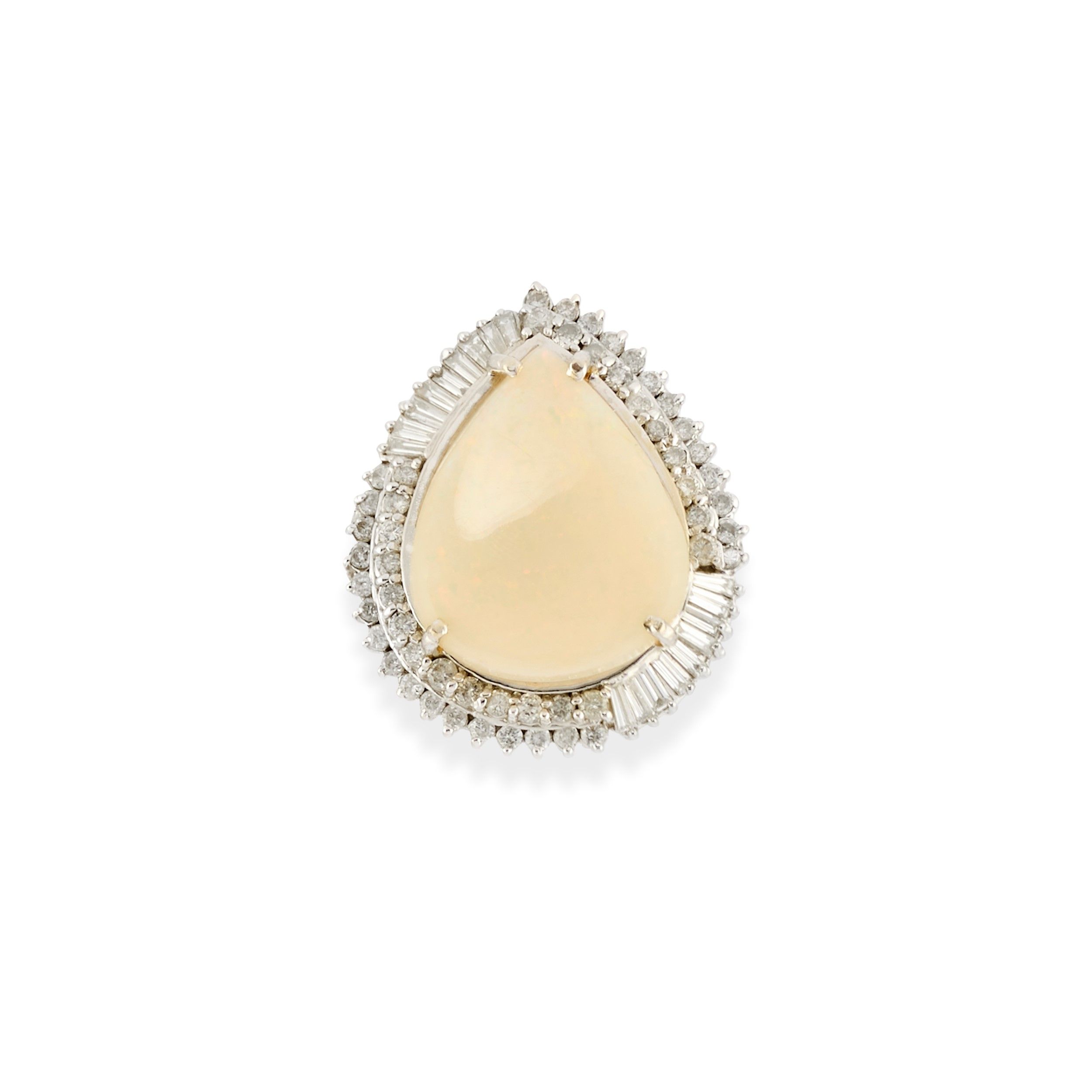 cornice in diamanti taglio brillante e baguette per totale ct 2,50 circa, al centro grande opale taglio goccia, difetti (visibile mancanza di materiale sull'opale e rottura sulla montatura).