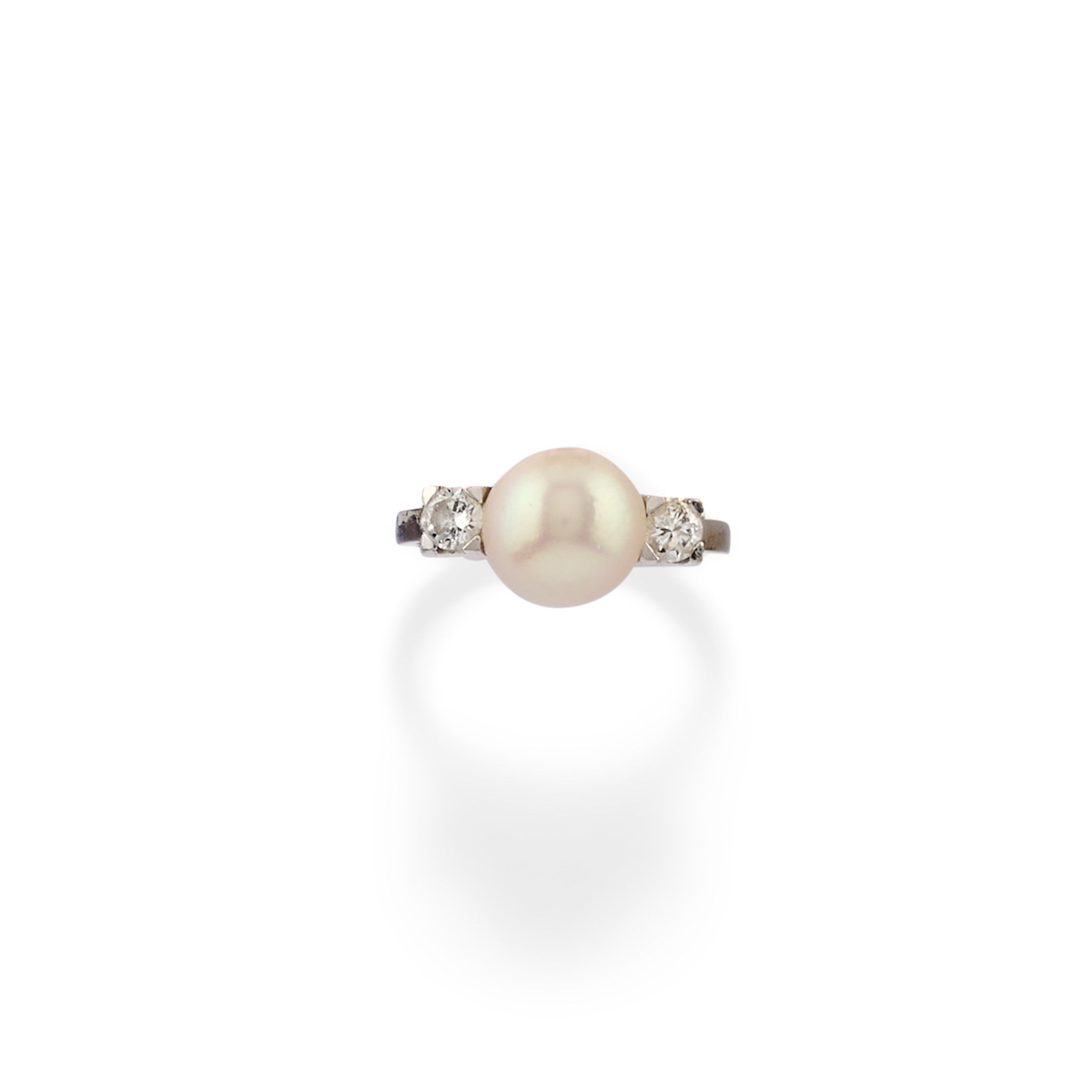 perla coltivata di mm 9,00 circa, ai lati due diamanti taglio brillante per totale ct 0,30 circa.