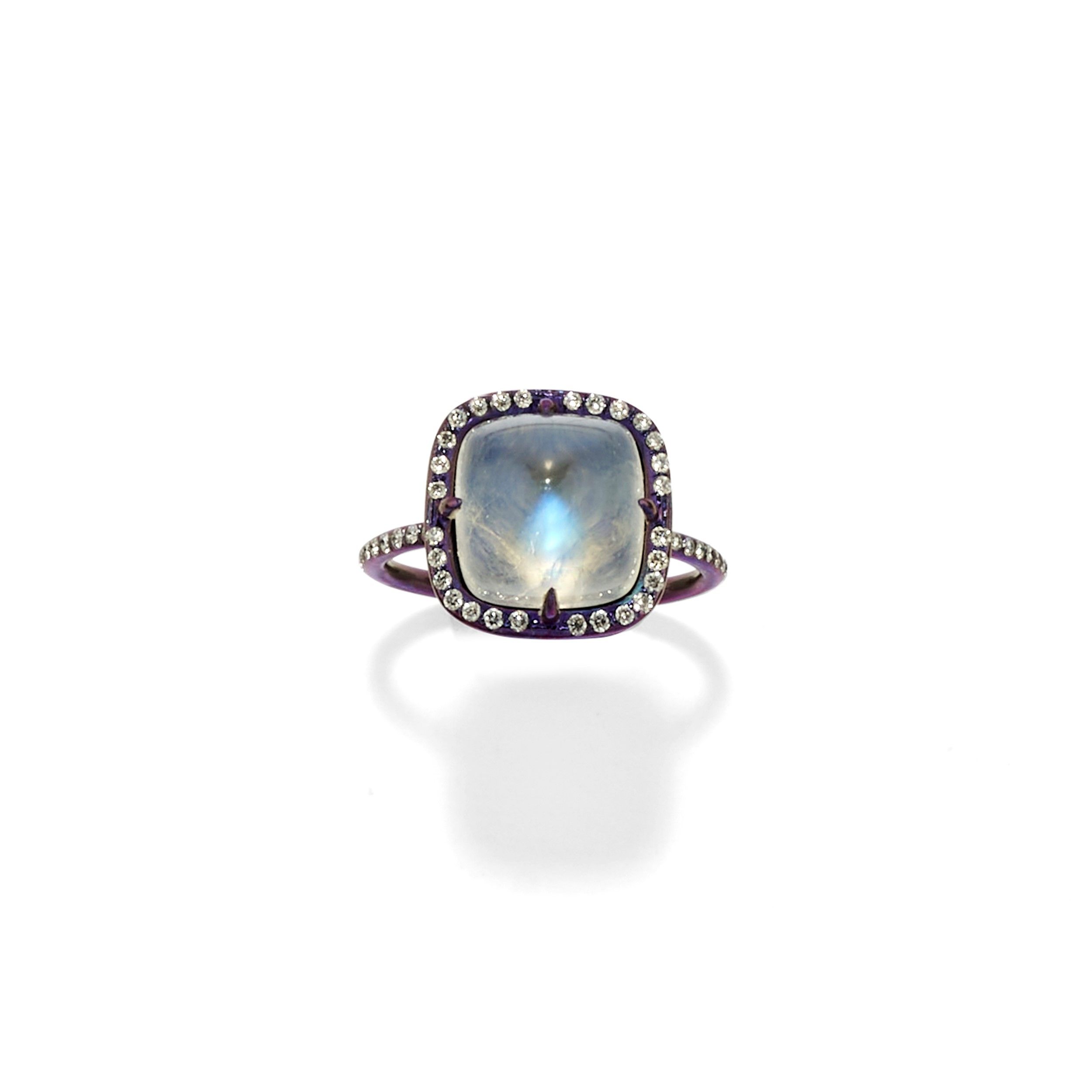 al centro pietra di luna taglio suguar loaf, decoro in diamanti taglio brillante disposti sulla cornice e sulla montatura.