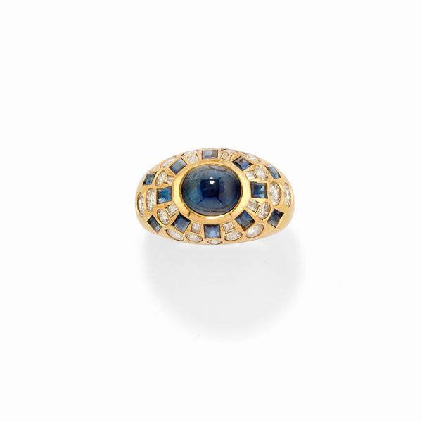 a cupola con al centro zaffiro taglio ovale cabochon, contorno in zaffiri taglio rettangolare per totale ct 0,70 circa e diamanti taglio baguette e brillante per totale ct 1,00 circa.