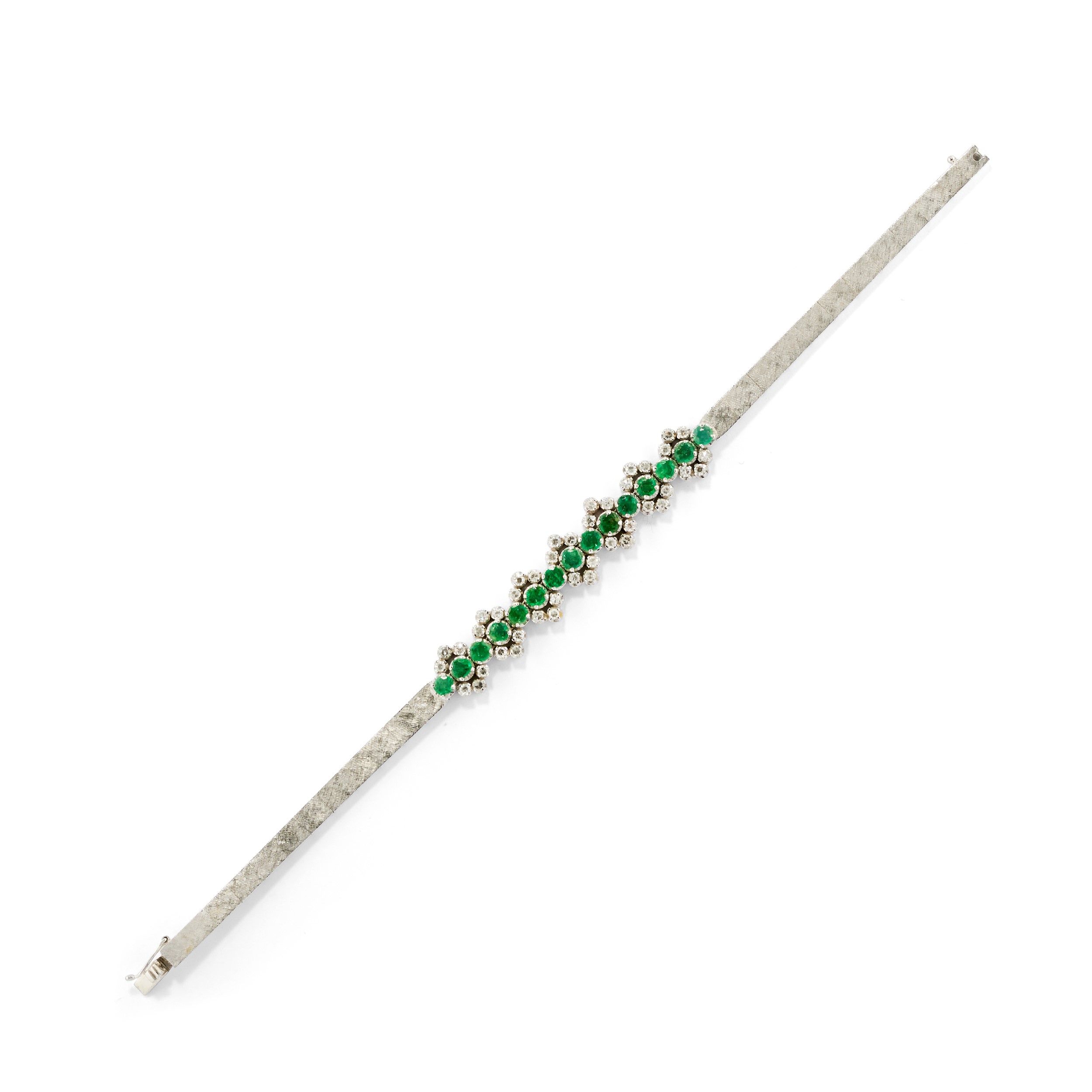 maglia satinata, percorsa al centro da motivi a fiori, in smeraldi taglio rotondo e diamanti taglio huit-huit.