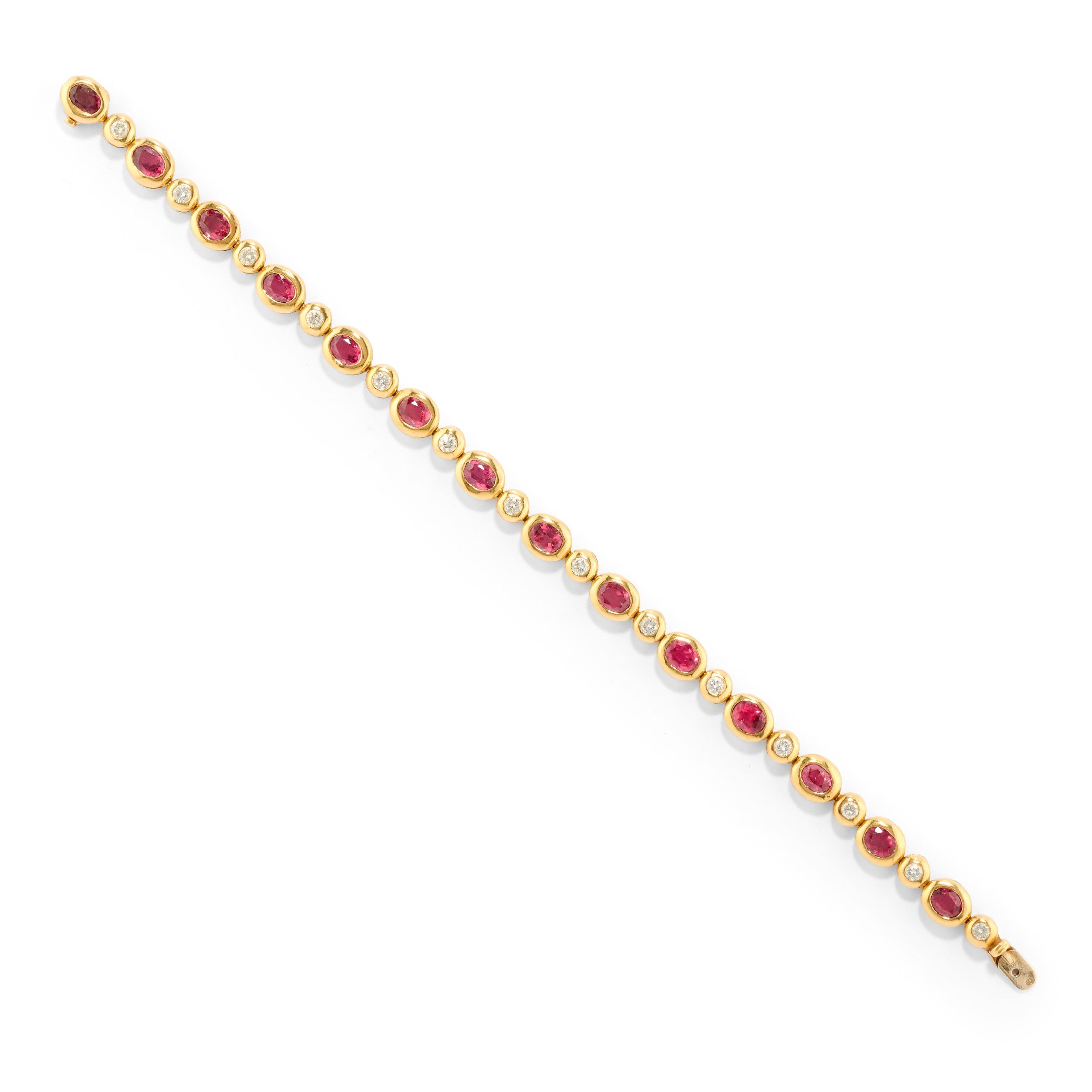 ad una fila di rubini taglio ovale per totale ct 5,00 circa, alternati a diamanti taglio brillante per totale ct 0,70 circa, entro castoni a cipollina.