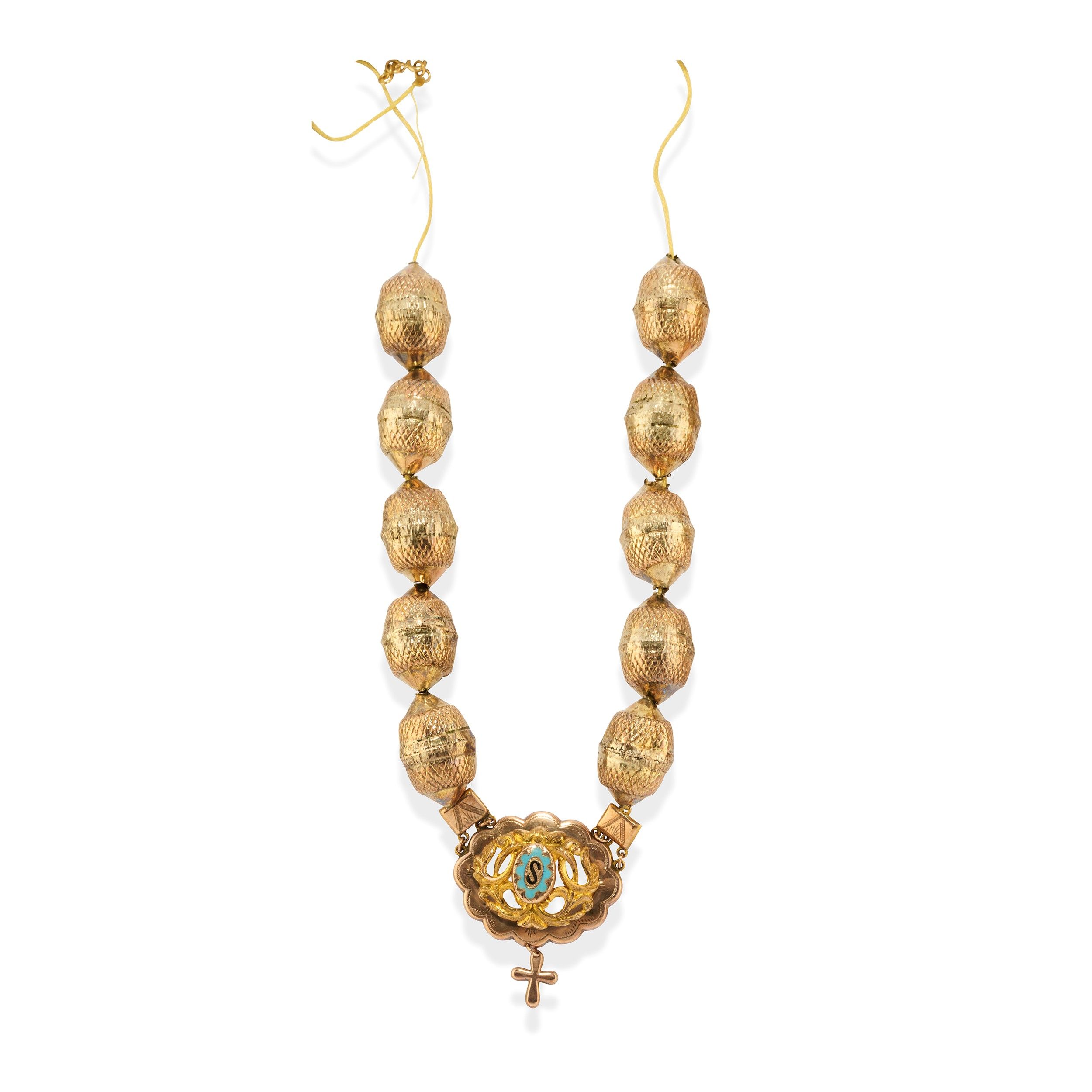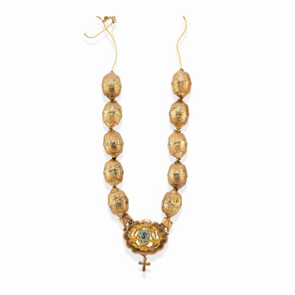 XIX Secolo con dieci inserti ovali incisi e centrale a scudo con decoro in smalto nero e azzurro, cordoncino in cotone, con astuccio, difetti (ammaccature).