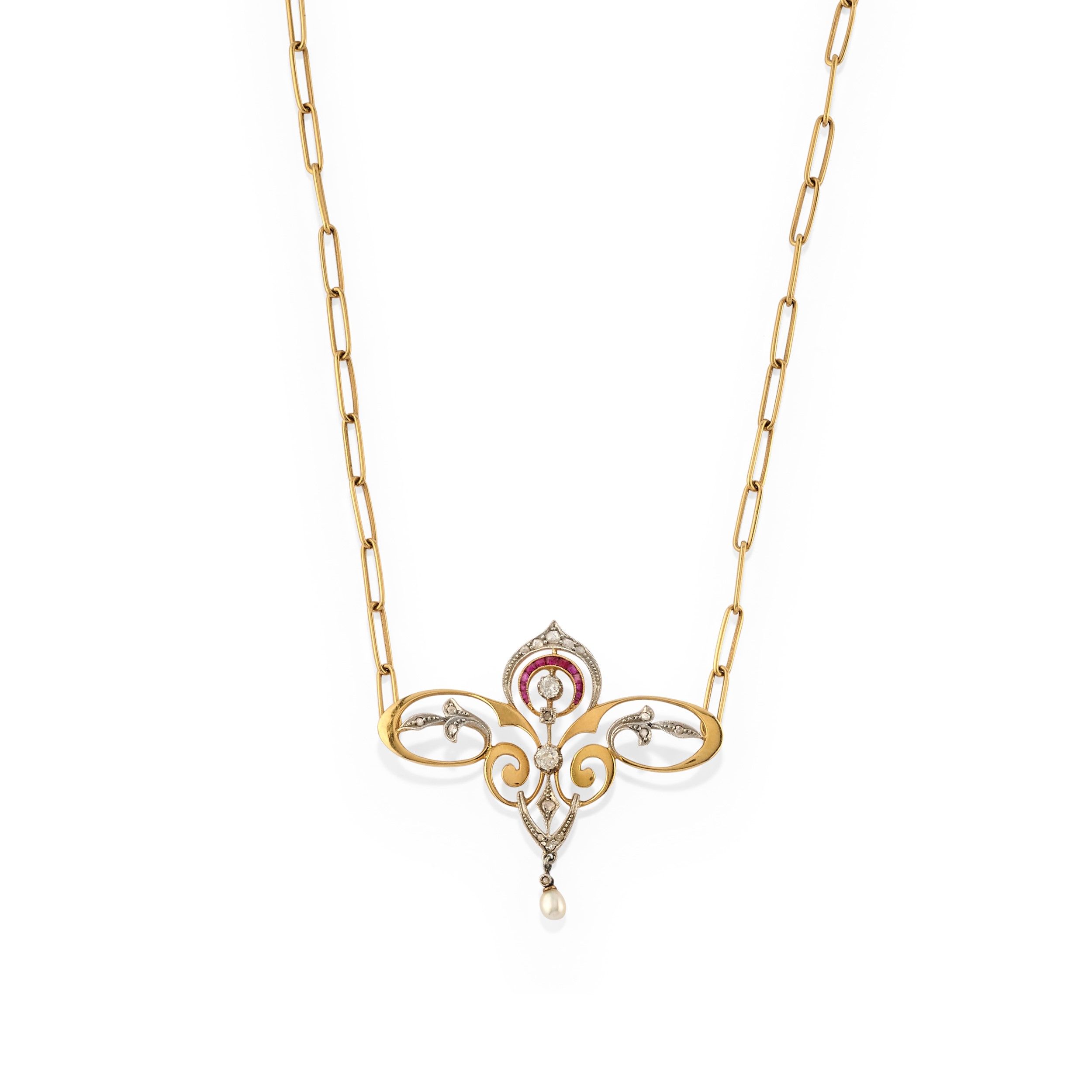 pendente di gusto liberty con piccola perla, diamanti taglio vecchio e rosa, rubini taglio carré, maglia a catena.