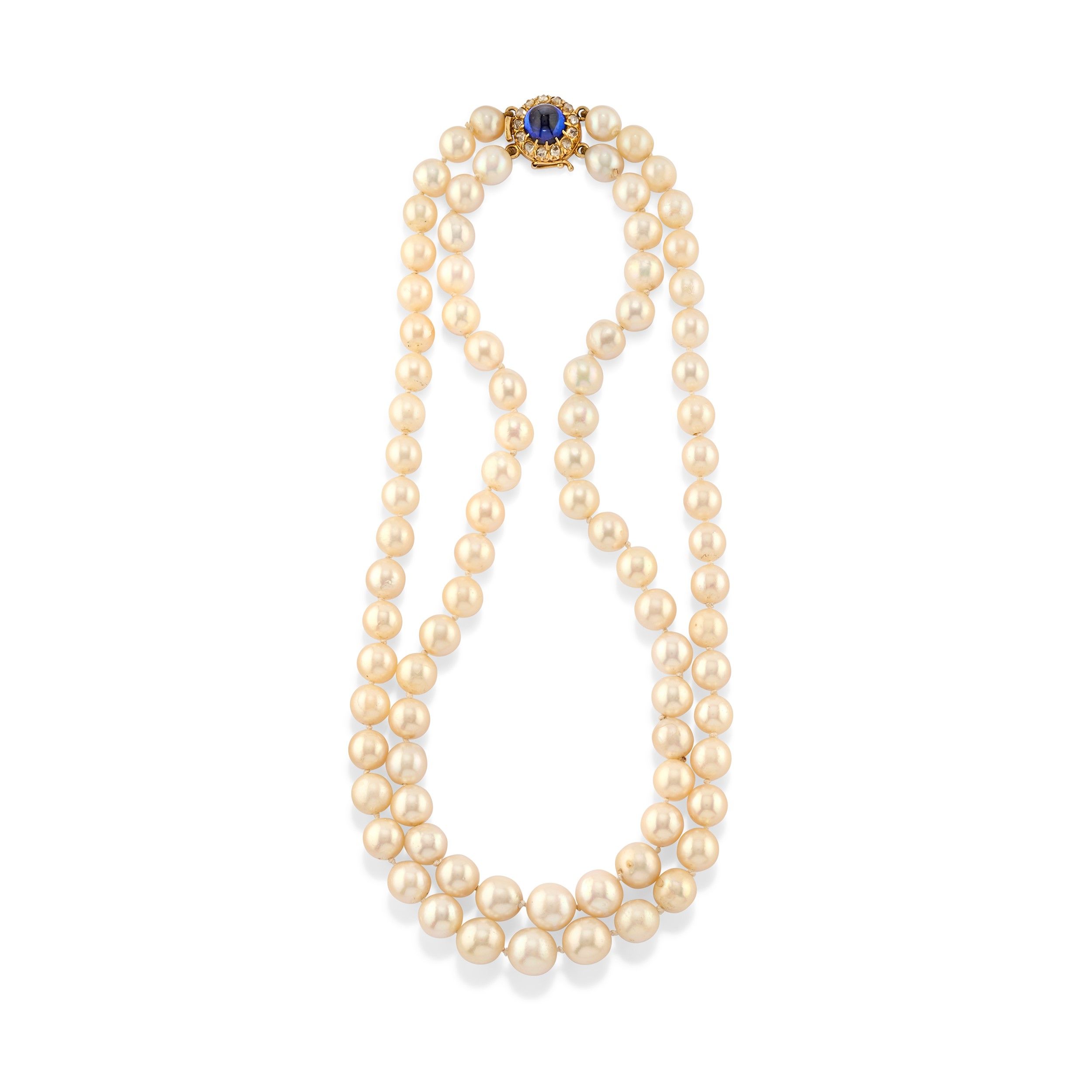 realizzata a due fili di perle coltivate di mm 8,00/8,50 circa, chiusura impreziosita da zaffiro sugar loaf sintetico entro giro di diamanti taglio rosa.