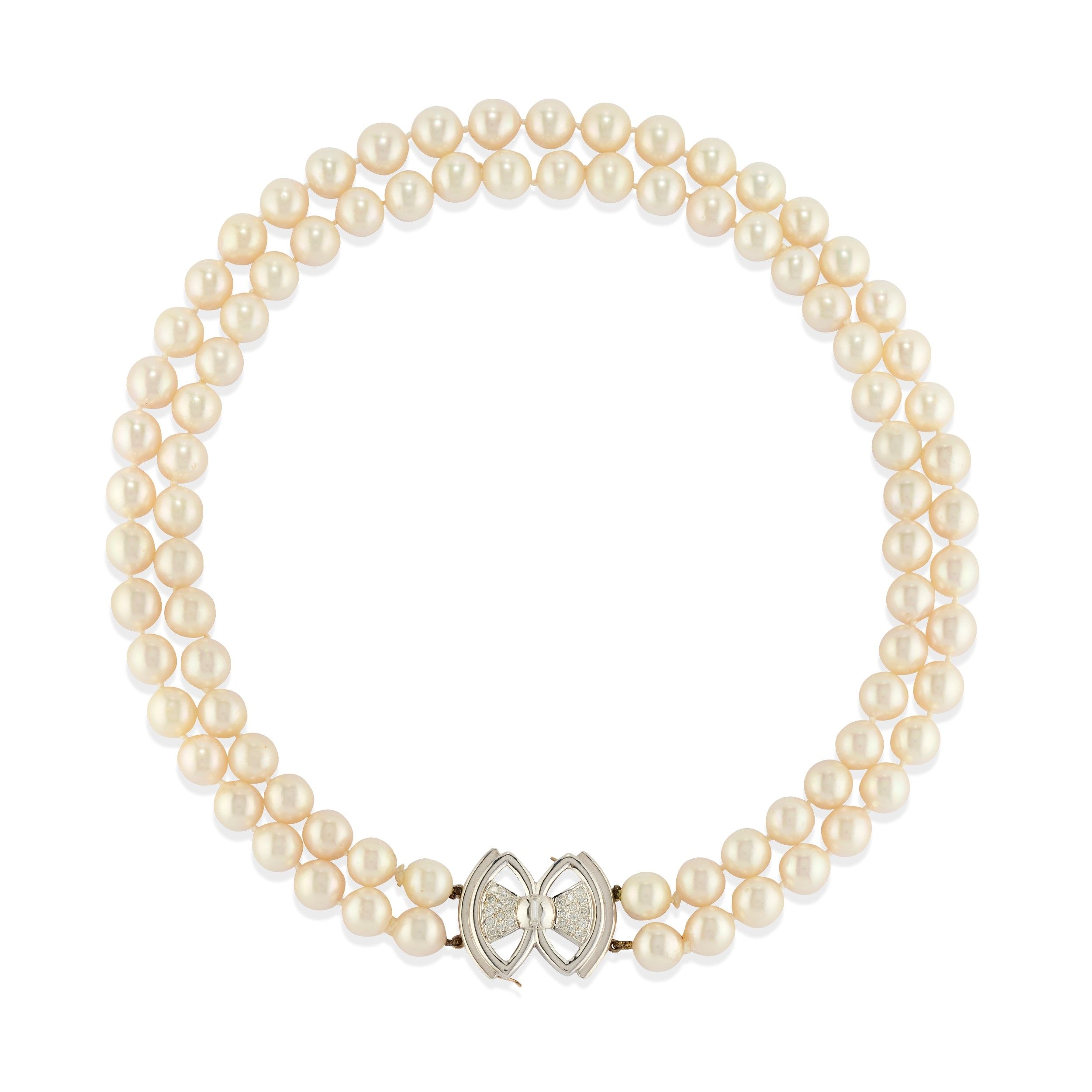 a due fili di perle coltivate Giappone di mm 9,00/9,50 circa, chiusura a fiocco decorata da diamanti taglio brillante.