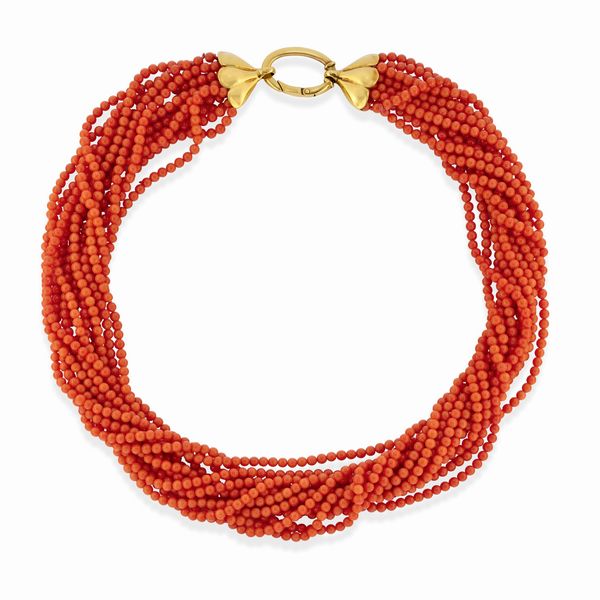 a torchon, realizzata a dodici fili di boules di corallo rosso.