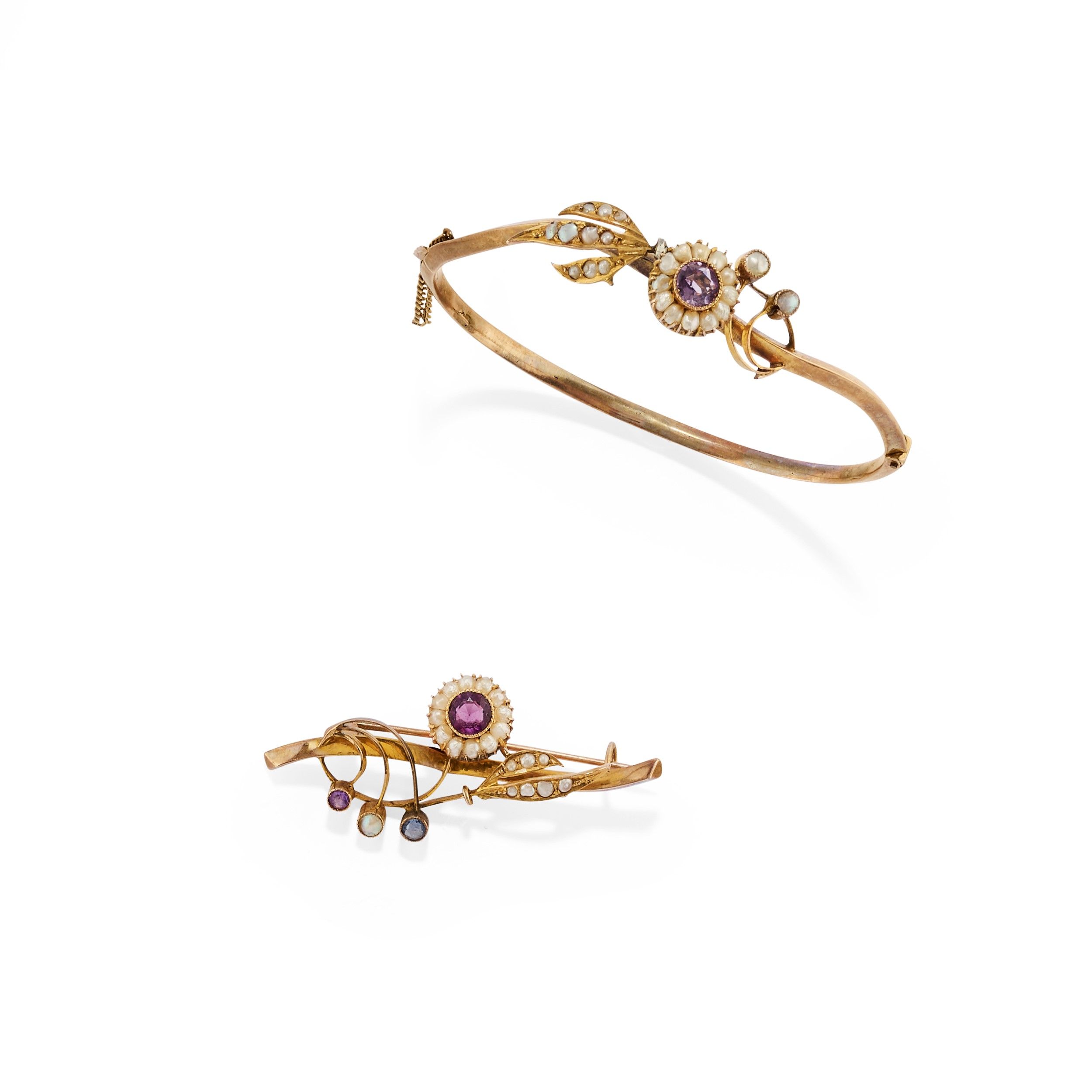composta da bracciale rigido e spilla, impreziositi da pietre colorate taglio rotondo e micro perle.