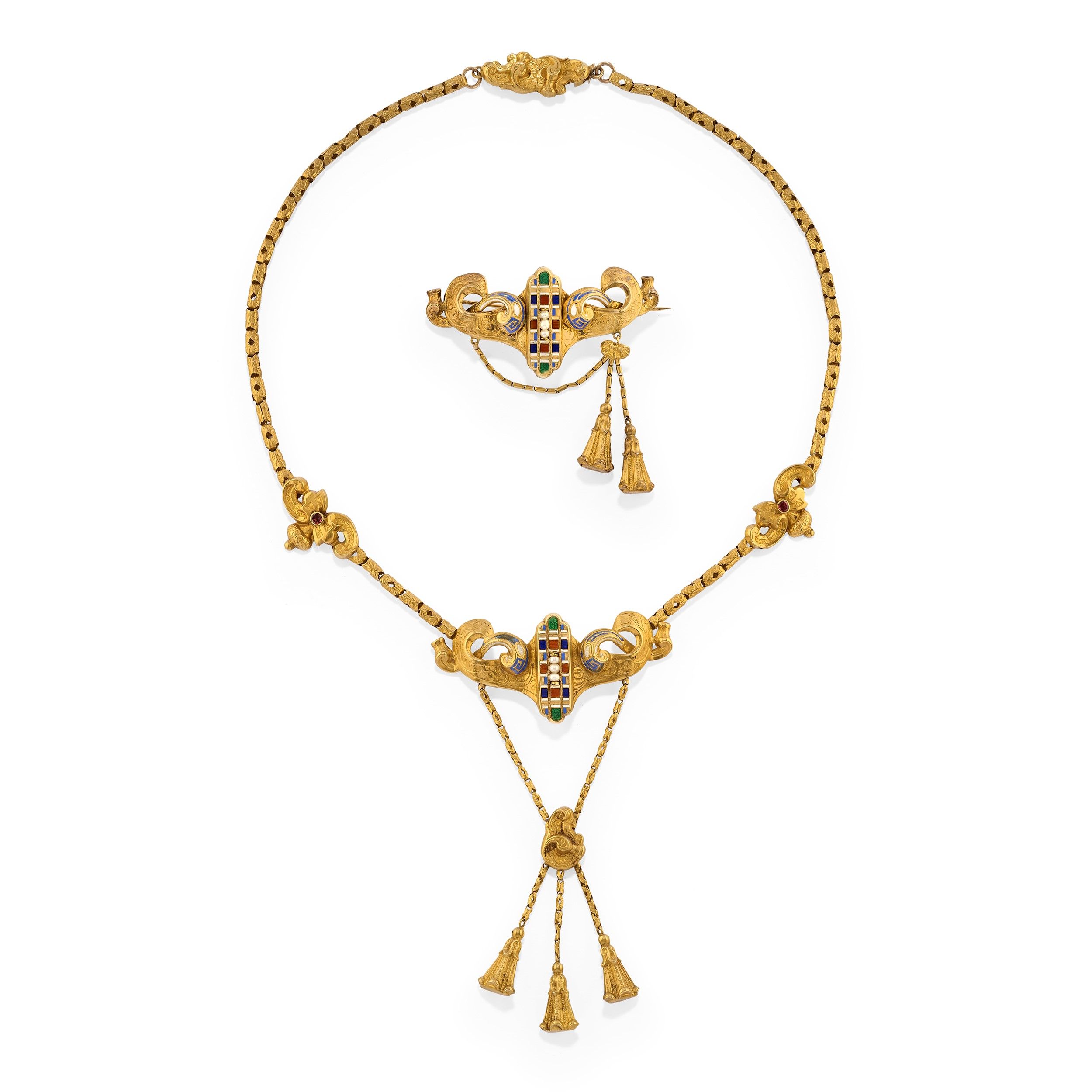 XIX secolo composta da collana e spilla con motivi frangiati, decori a volute, al centro motivi smaltati e micro perle, difetti (lievi mancanze di smalto).