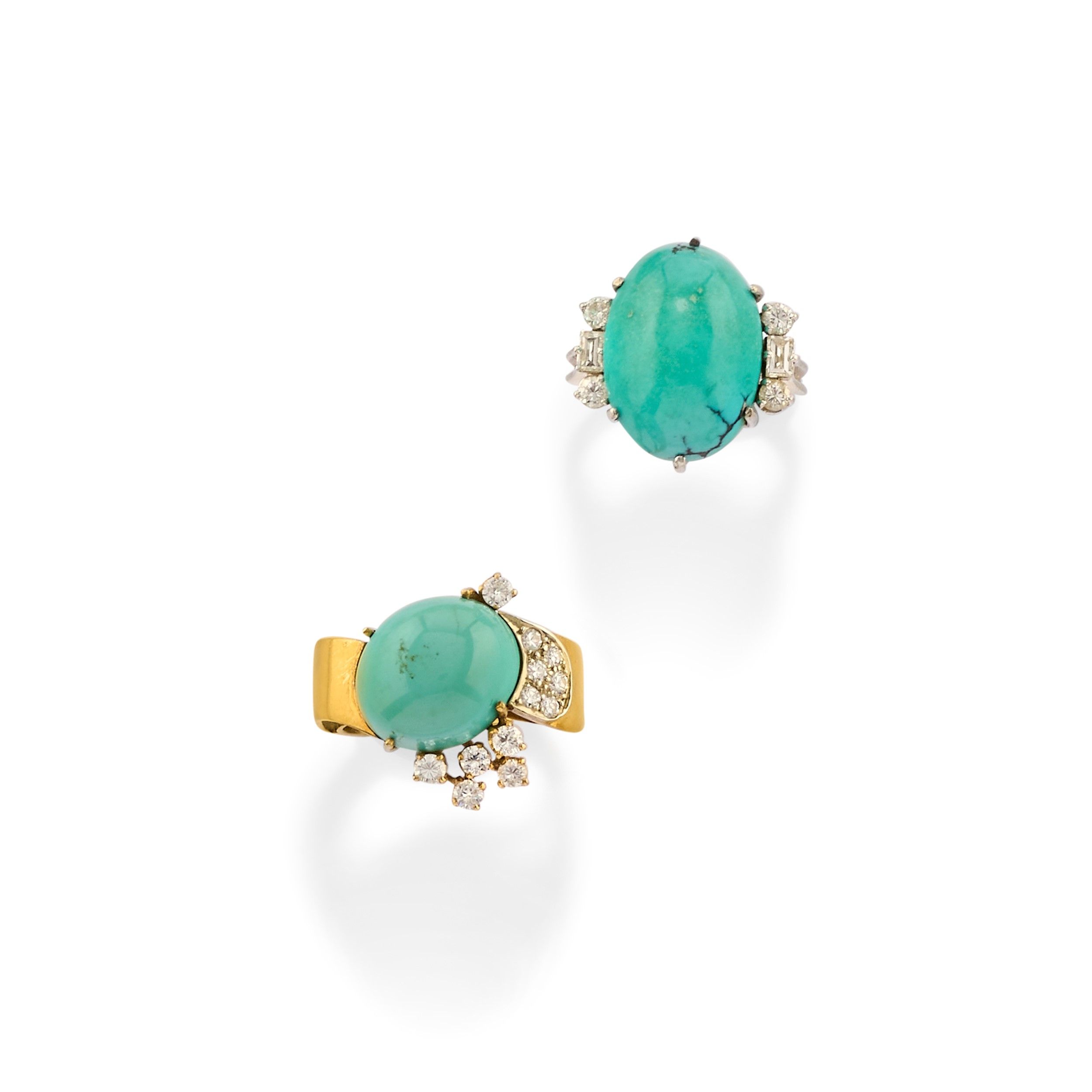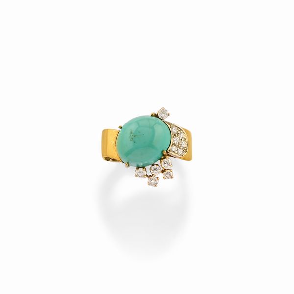 al centro turchese taglio ovale cabochon, ai lati diamanti taglio brillante e baguette.
