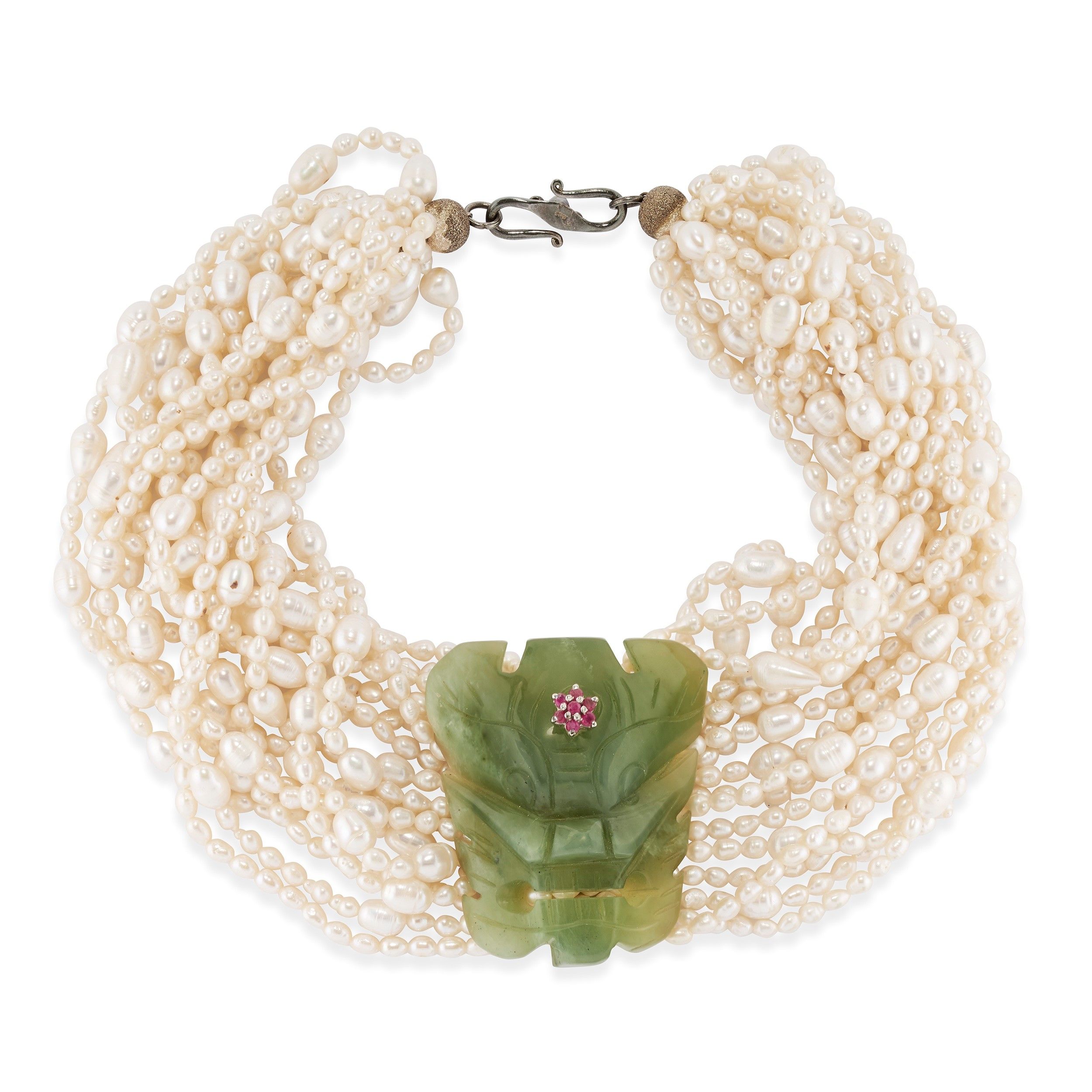 a torchon con fili di perle coltivate di acqua dolce, giadeite inciso a mascherone e rubini taglio rotondo.