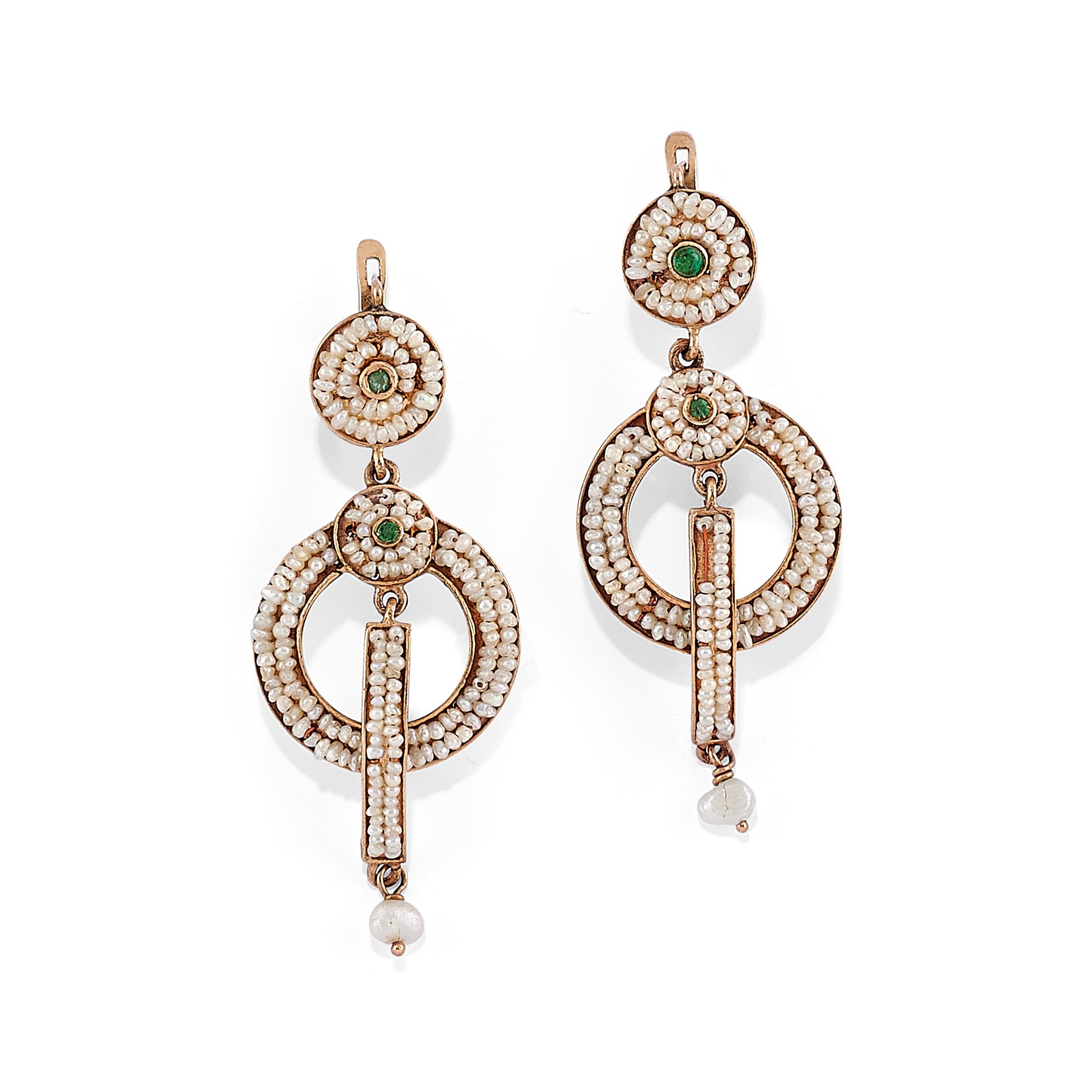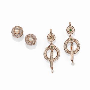 una coppia realizzata a bottone con al centro madreperla e diamanti sintetici, l'altra pendente con pietre verdi e microperle su filo passante, difetti (alcune microperle mancanti).