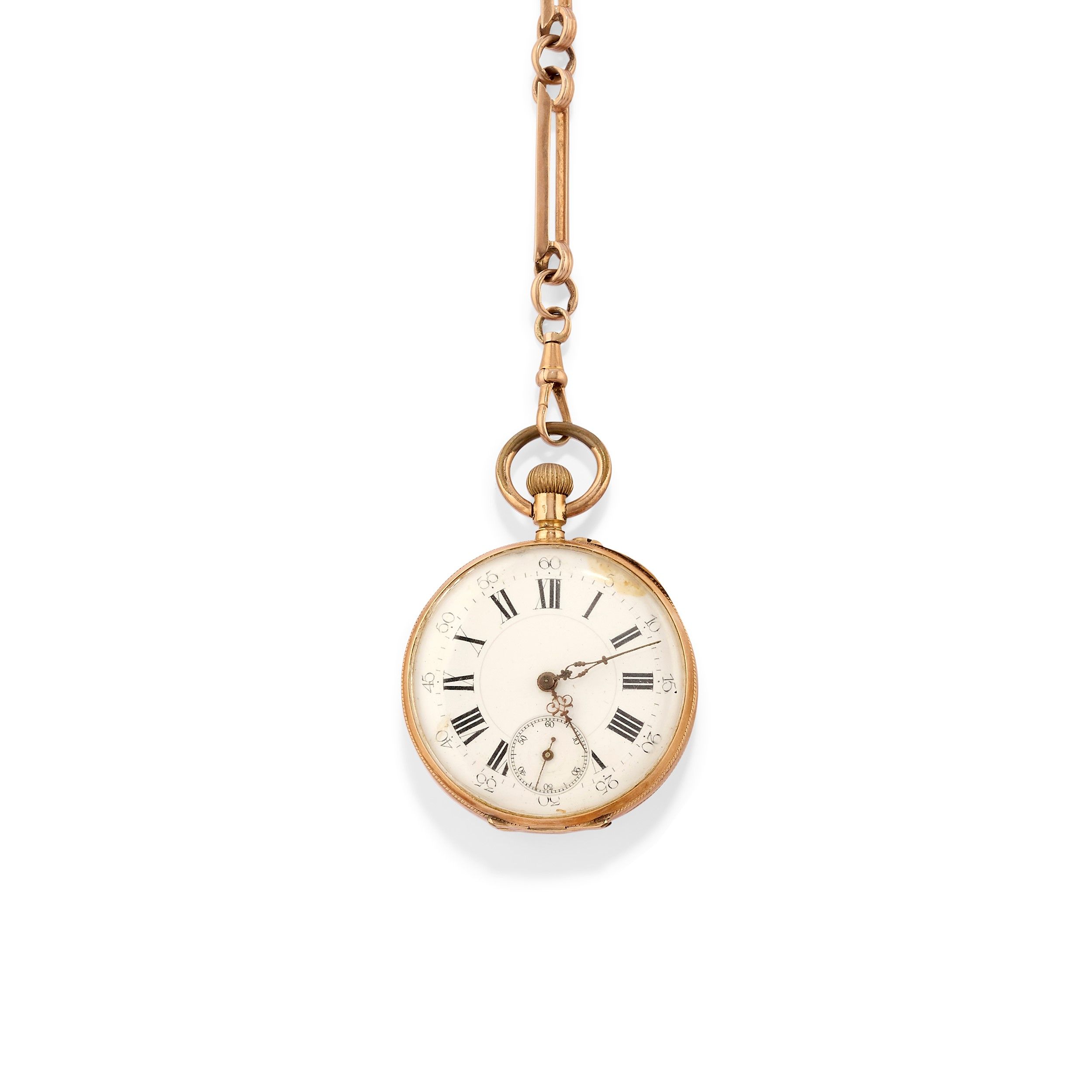 casse rotonde, quadranti chiari con numeri romani in smalto nero, uno con secondi al sei, movimenti a carica manuale, catene in oro bassa caratura, difetti (segni d'usura su un quadrante, da revisionare).