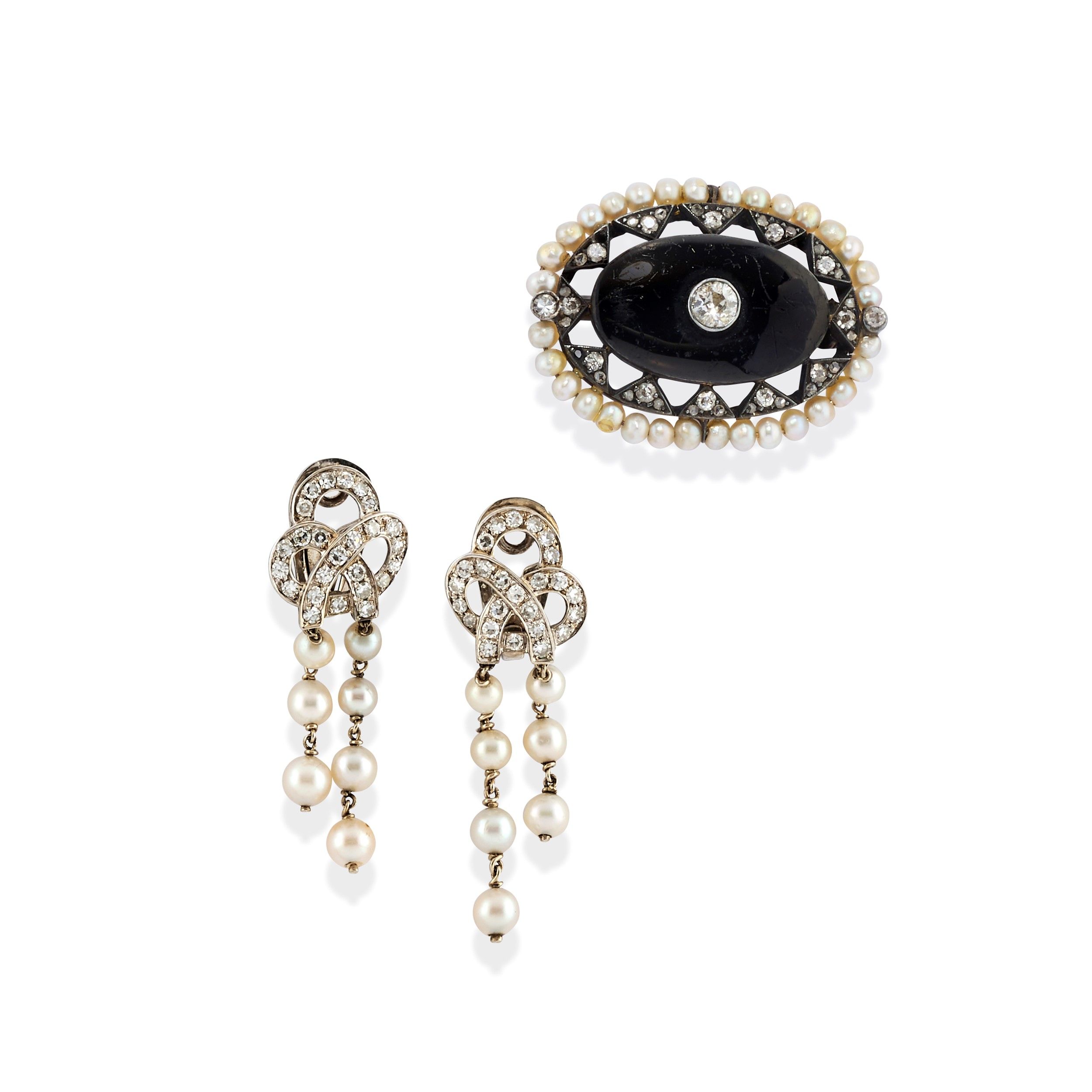 composto da una spilla con onice, perle, diamanti taglio vecchio e huit-huit e da una coppia di orecchini a volute in diamanti taglio huit-huit con terminali in perle, chiusura a clip, difetti (diamante mancante e segni di usura sull'onice).