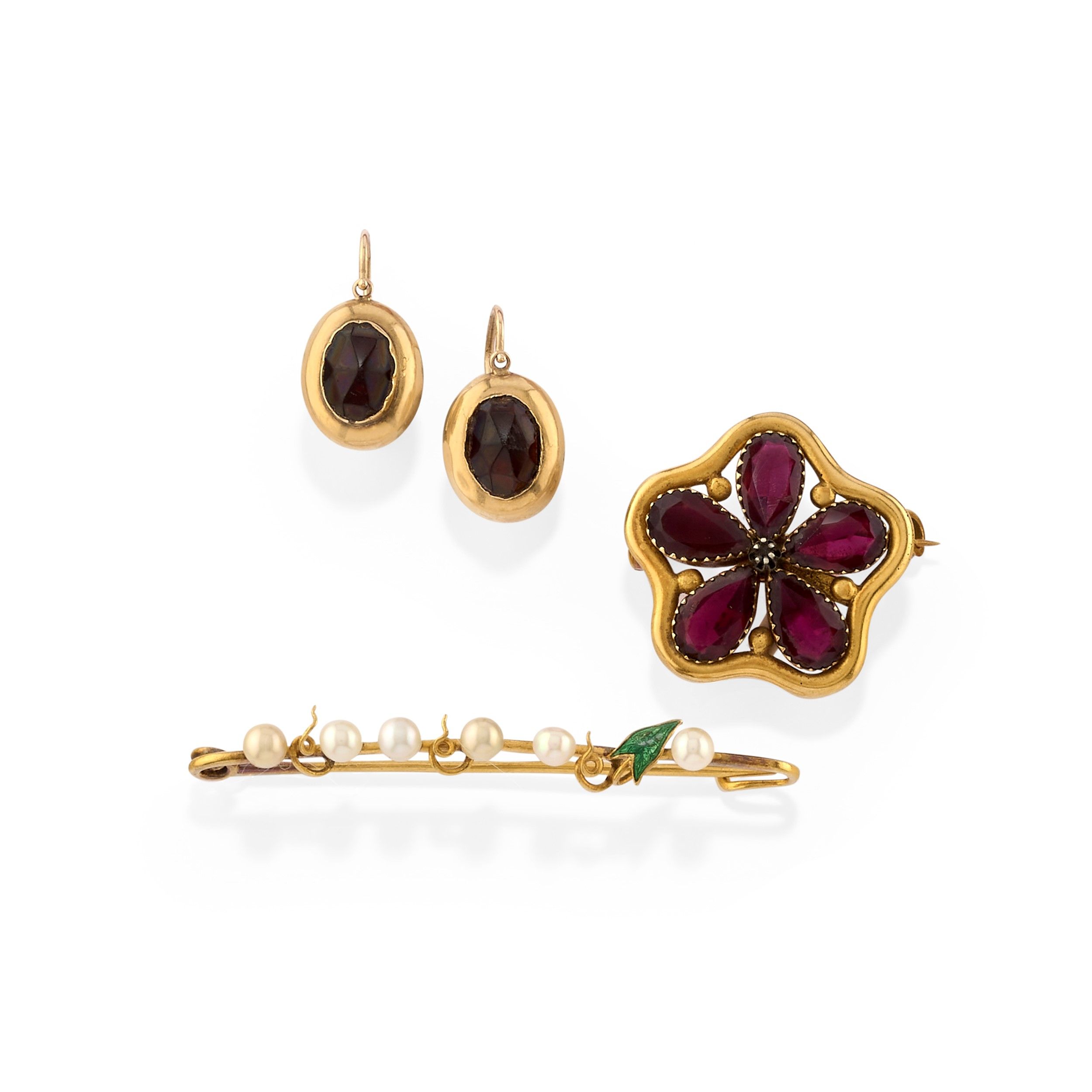 composto da due due spille ed una coppia di orecchini con chiusura a monachella, impreziositi da perle coltivate e pietre rosse.