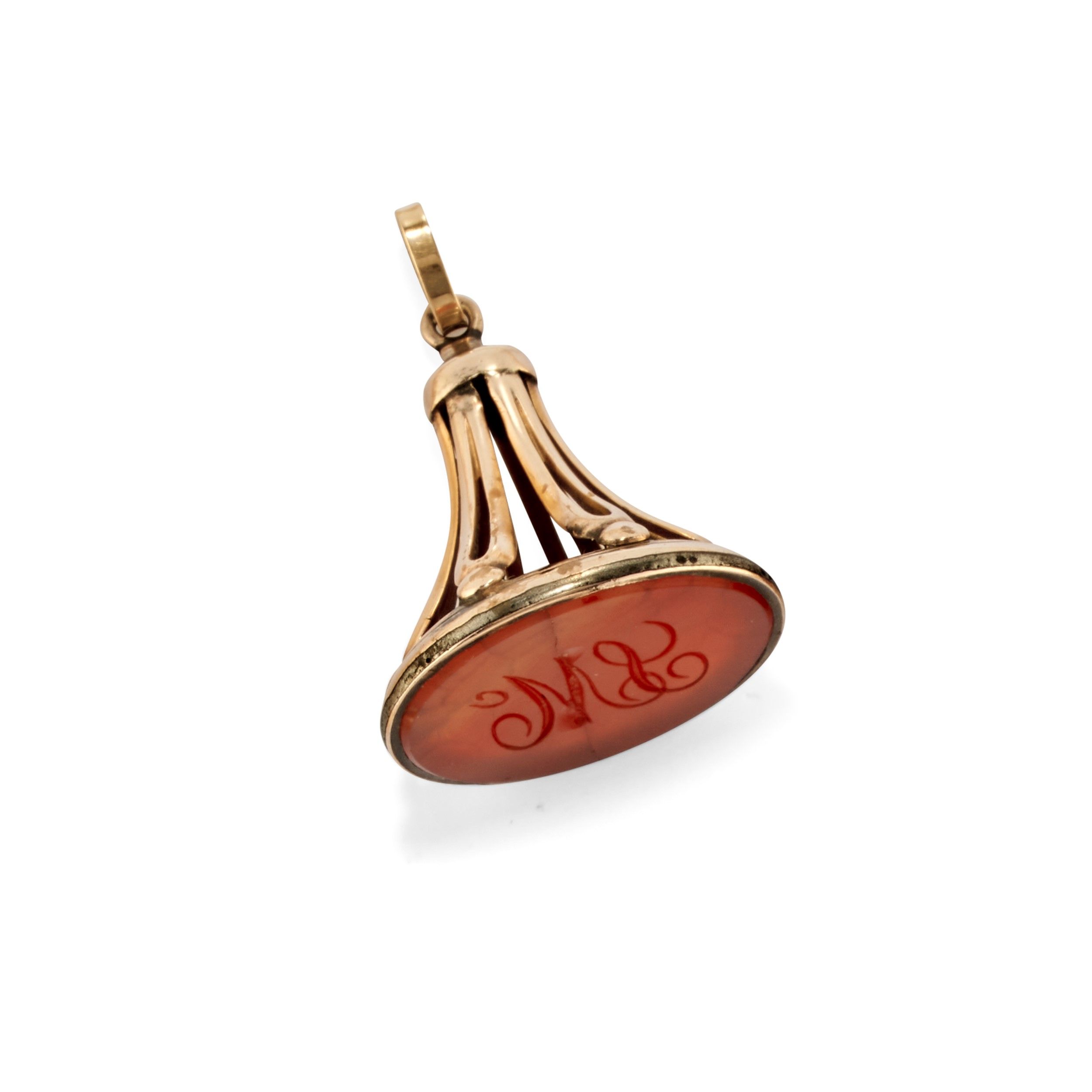 composto da collana a tre fili di perle coltivate, pendente con cameo inciso in basso rilievo e da sigillo, corniole e pasta vitrea.