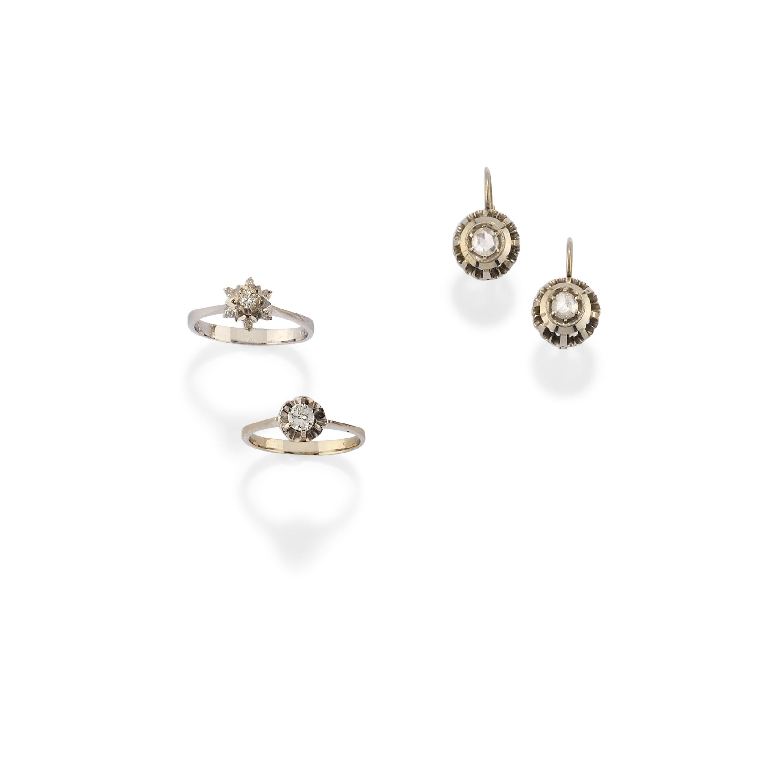 composto da due anelli e una coppia di orecchini con chiusura perno e clip, diamanti taglio brillante, huit-huit e rosa.