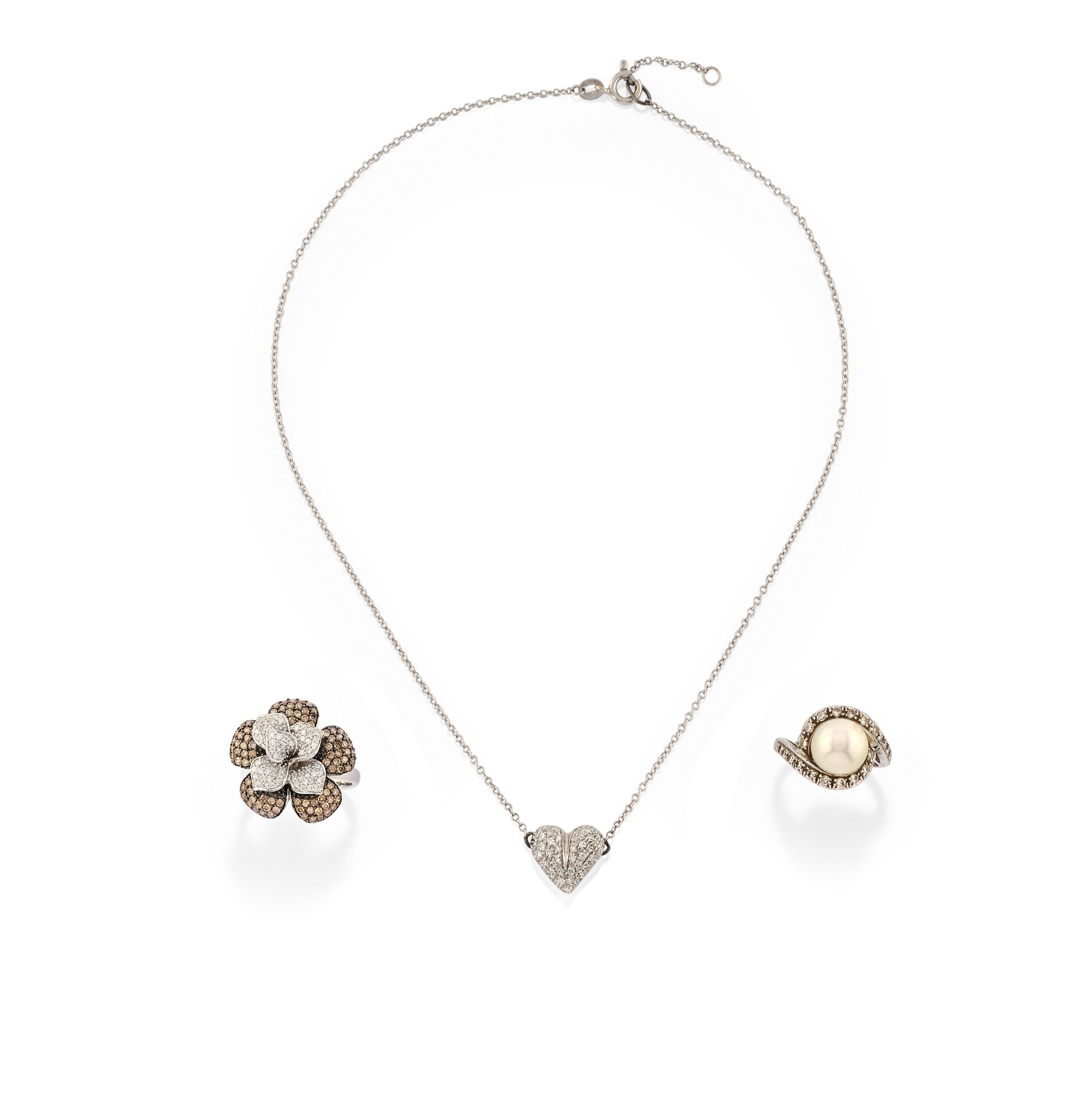 composto da una spilla a volute, un anello con perla coltivata e una collana con motivo a cuore diamante taglio brillante e huit-huit.
