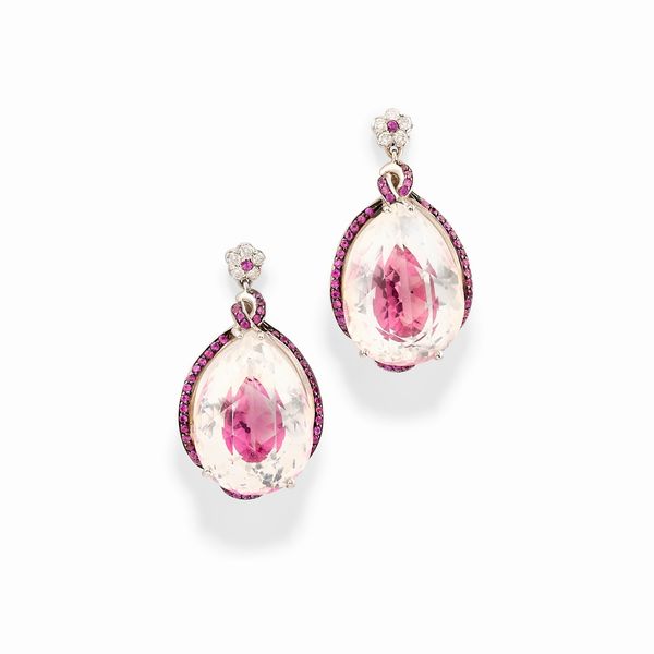 pendenti in cristallo di rocca taglio goccia briolette, diamanti taglio brillante per totale ct 0,30 circa e zaffiri rosa taglio rotondo