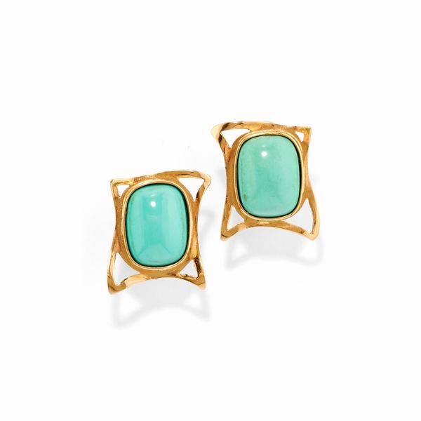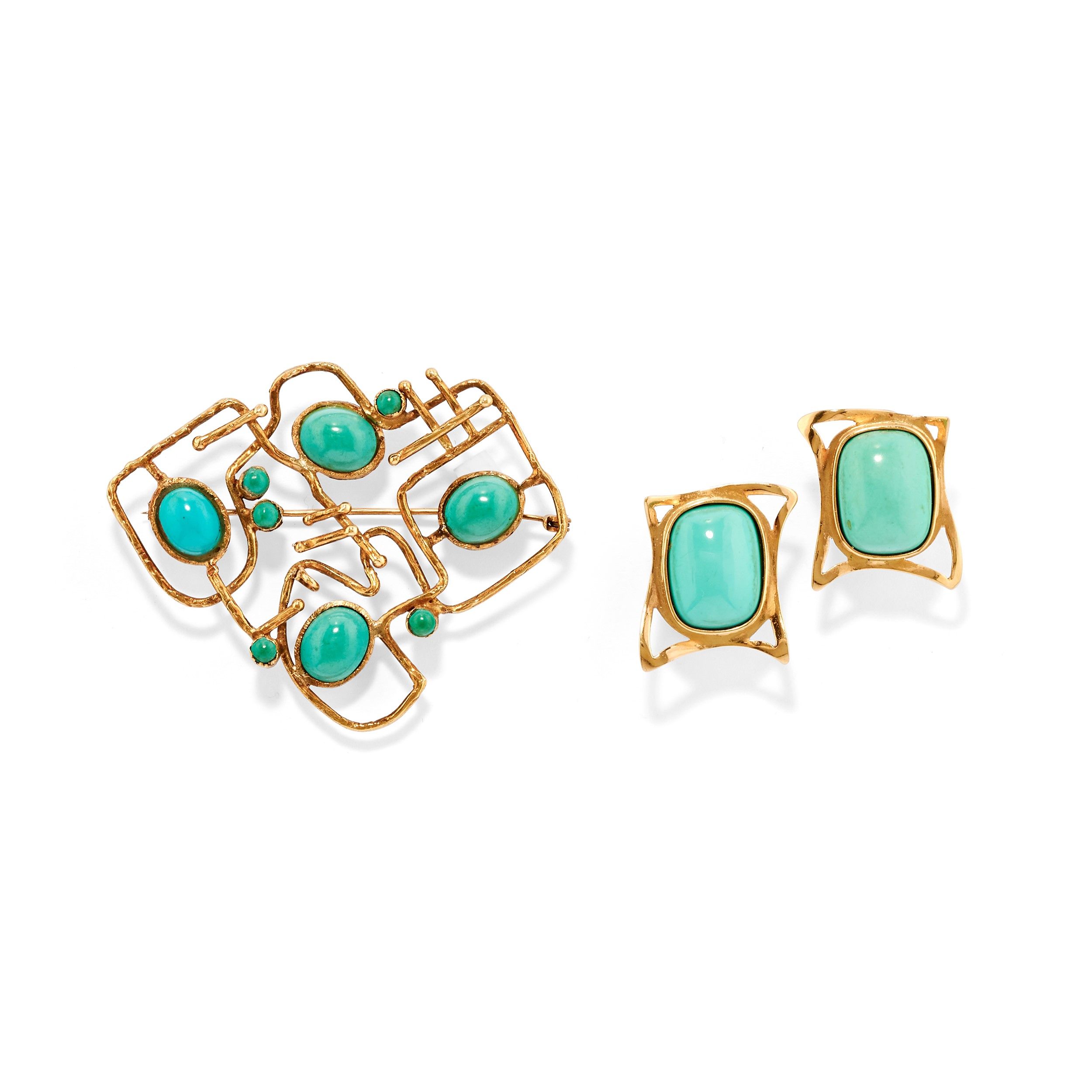 spilla stilizzata con turchesi taglio ovale e rotondo cabochon e coppia di orecchini con turchesi taglio cuscino cabochon, chiusura perno e clip.