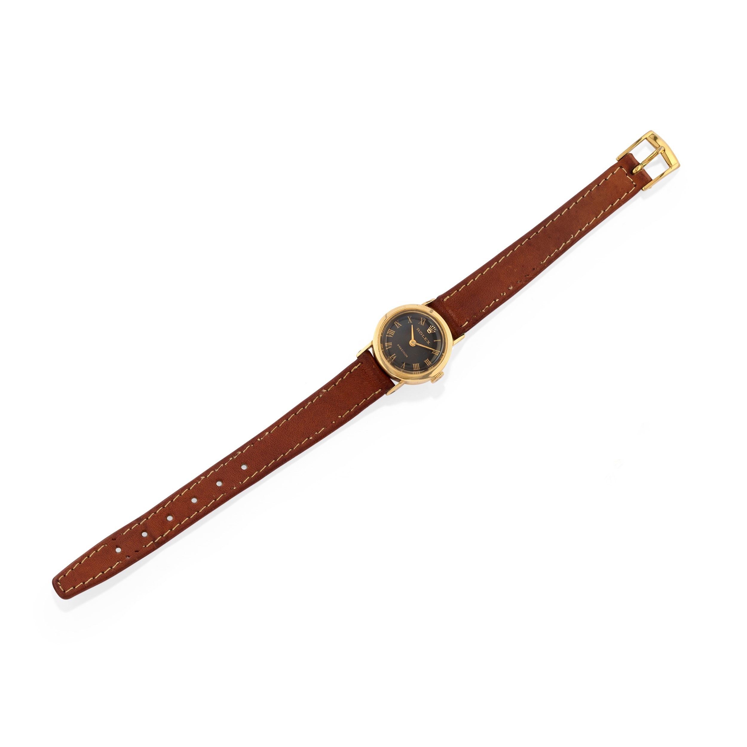 Rolex Precision, cassa rotonda, quadrante nero con numeri romani in smalto, movimento a carica manuale, quadrante, cassa e meccanismo firmati, con fibbia non originale.