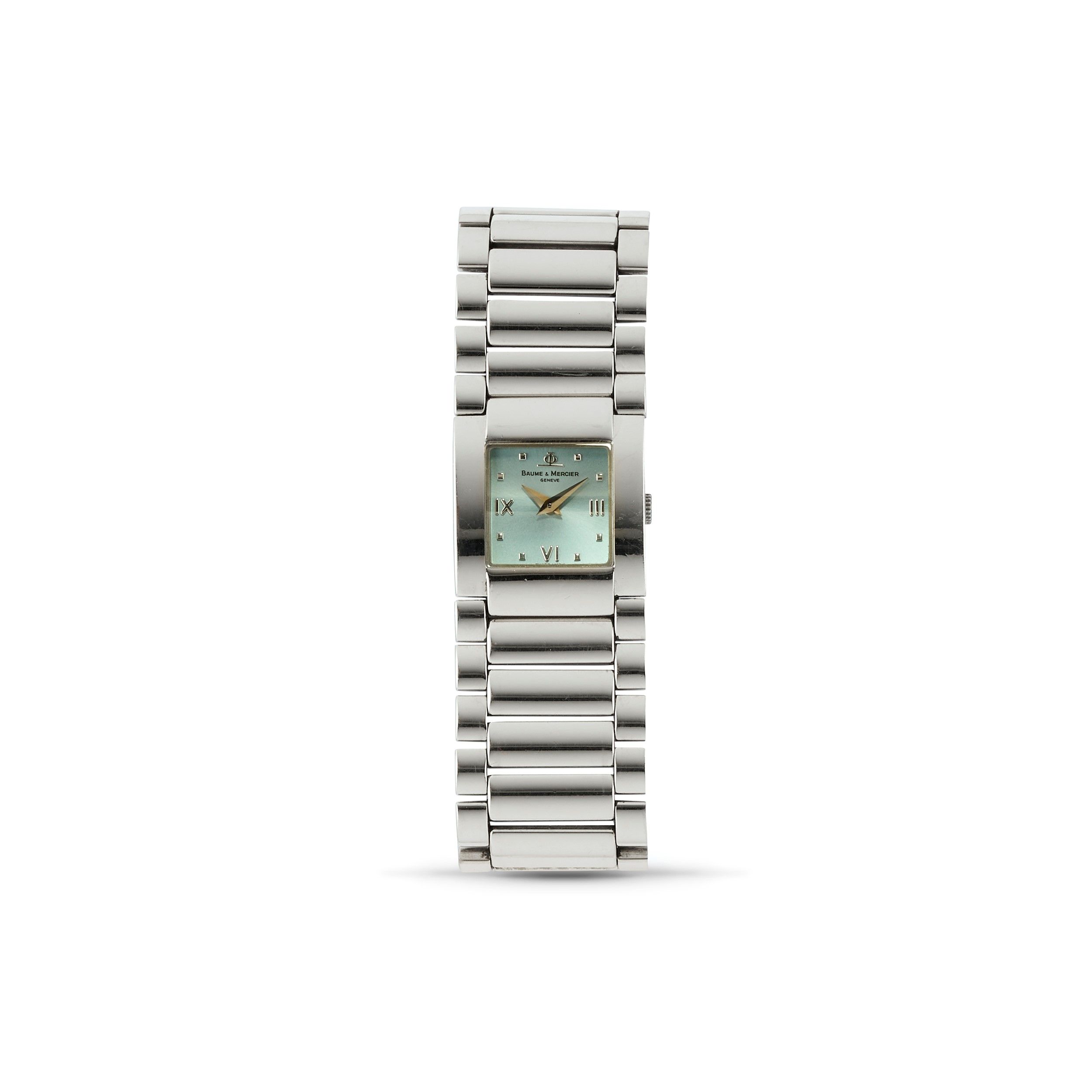 cassa quadrata, quadrante azzurro con numeri romani e indici applicati, movimento al quarzo, bracciale integrato, due maglie di allungamento.