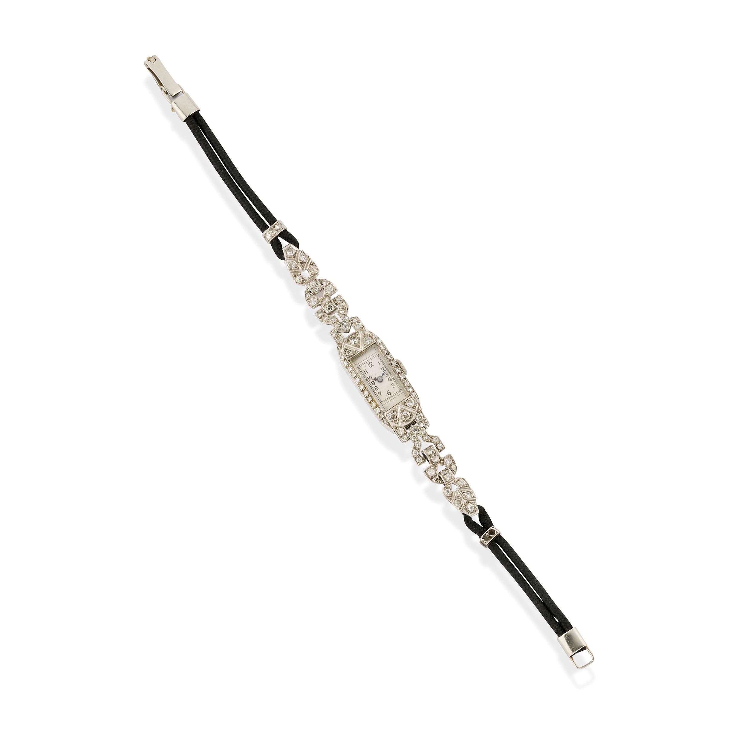 in oro bianco 18k e platino, Peso g 14,80 cm 16,50 1920 circa cassa rettangolare con indici e numeri arabi in smalto nero, movimento a carica manuale, cassa ed anse impreziosite da diamanti taglio huit-huit per totale ct 1,50 circa, cinturino in tessuto, difetti (un diamante mancante).