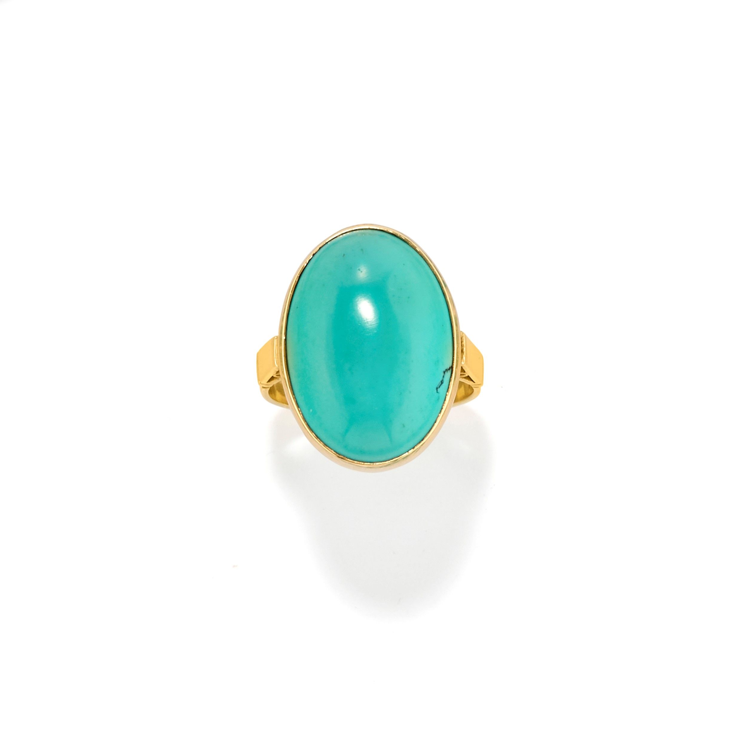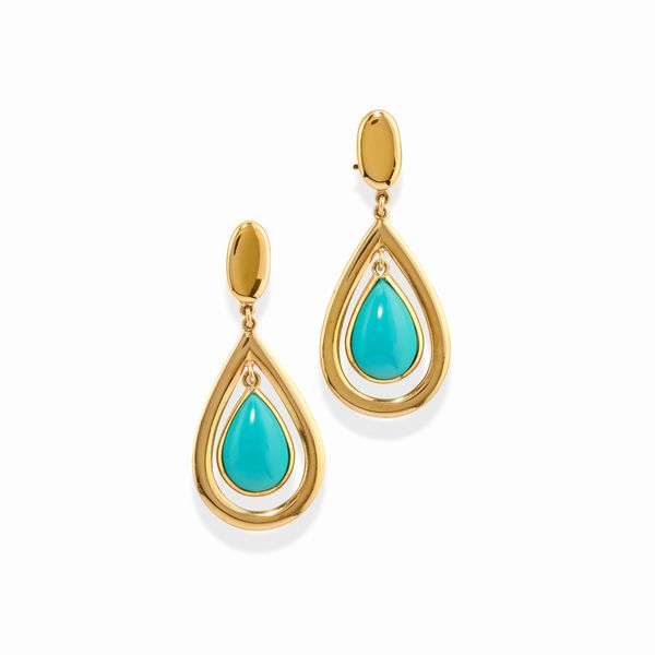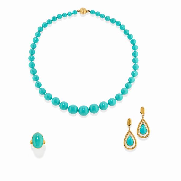 composta da collana e coppia di orecchini con chiusura perno e farfalla in pasta di turchese, anello con turchese.