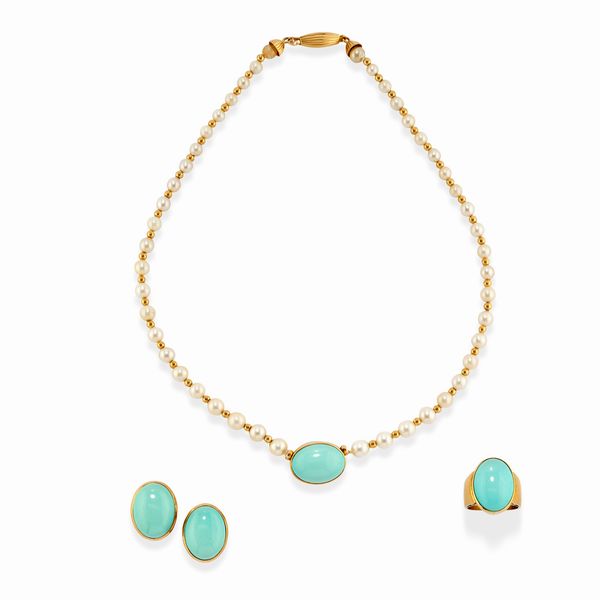 composta da collana ad un filo di perle coltivate, anello e coppia di orecchini con chiusura perno e clip.