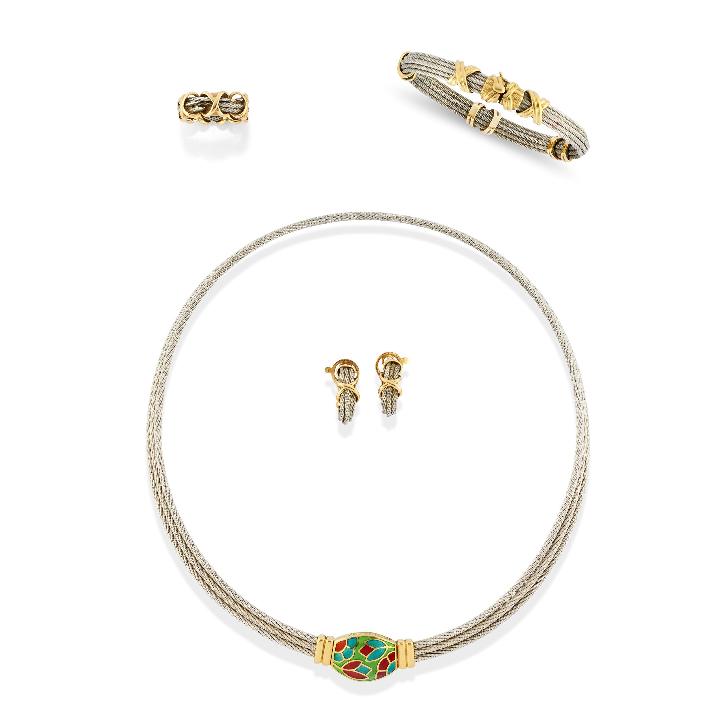 composta da collana con centrale in smalto policromo, bracciale, anello e coppia di orecchini con chiusura a clip.