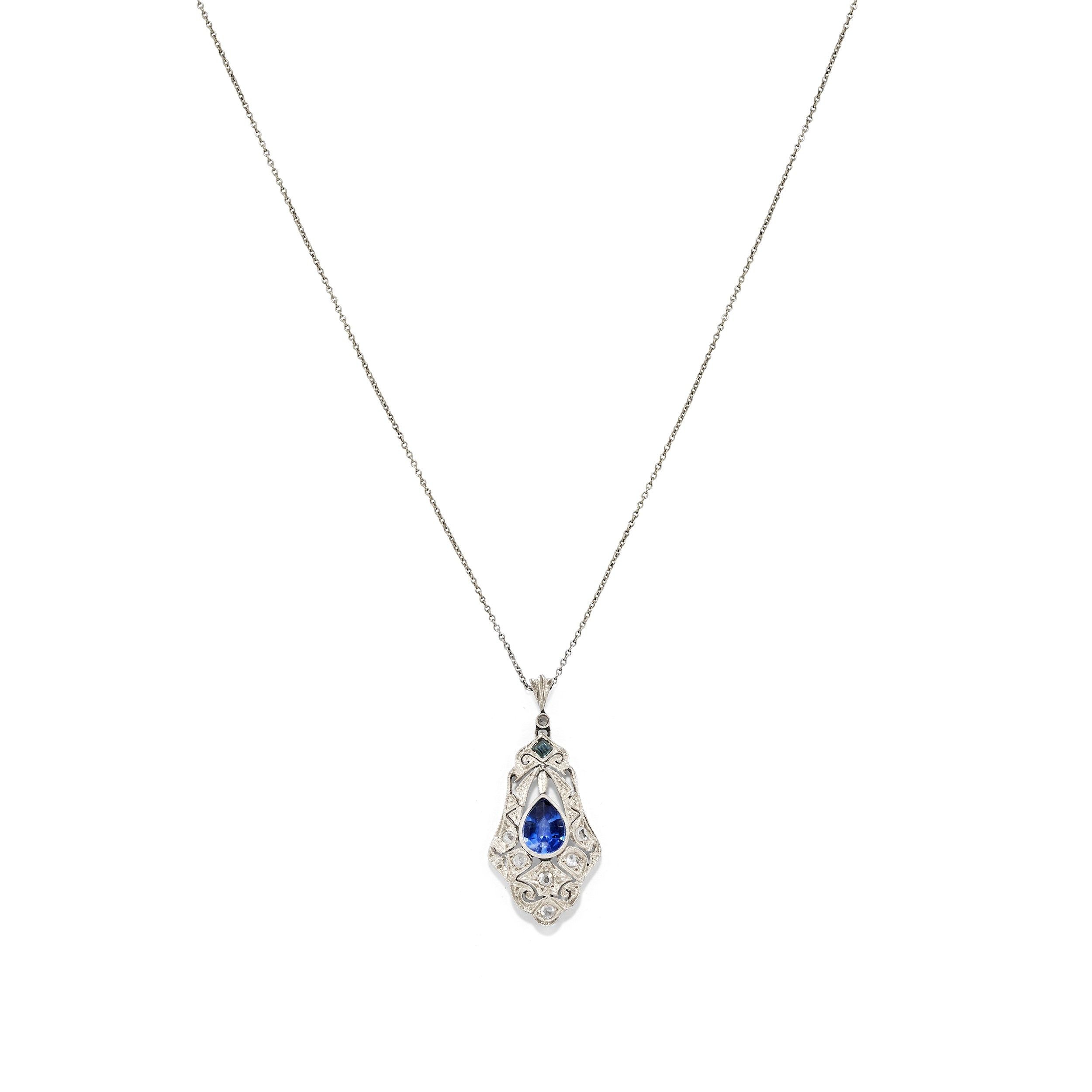 traforato, al centro zaffiro sintetico taglio goccia, piccoli diamanti taglio rosa, trattenuto da collanina.