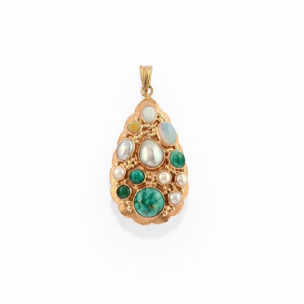 di forma a goccia con perle, opali e malachite taglio rotondo ed ovale cabochon.