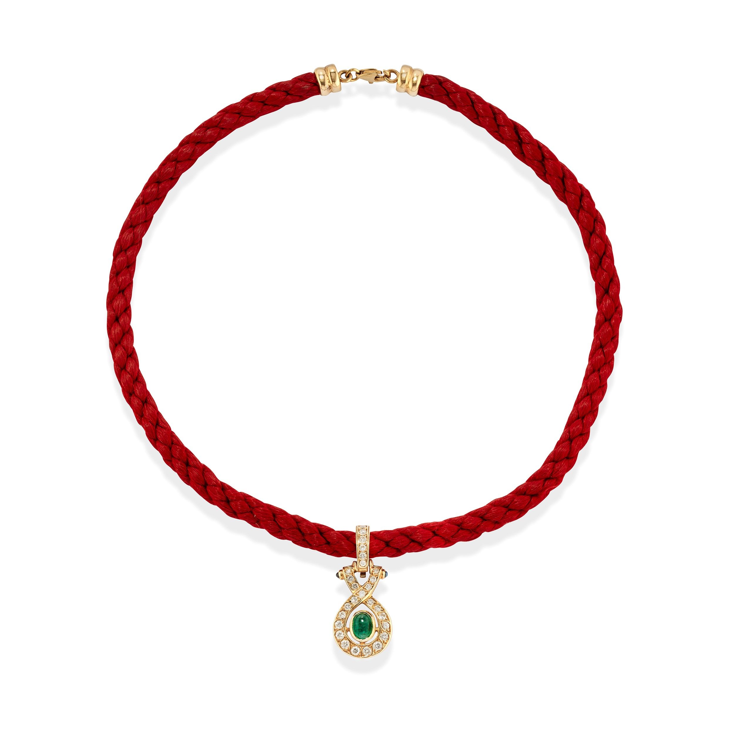 motivo ad intreccio con diamanti taglio brillante per totale ct 0,80 circa, al centro smeraldo taglio ovale cabochon di ct 1,00 circa, ai lati due piccoli zaffiri taglio rotondo cabochon, trattenuto da cordino rosso con terminali in oro.