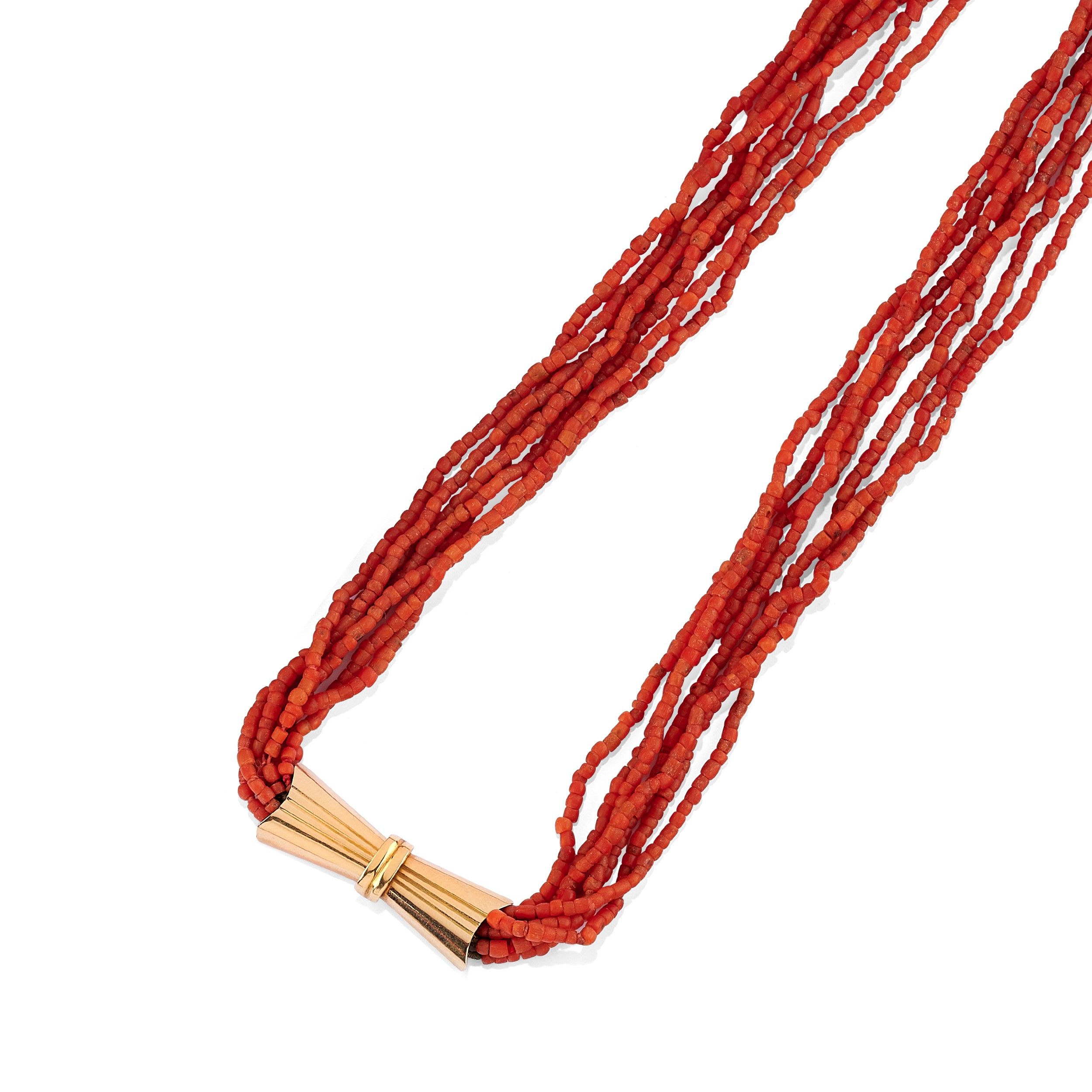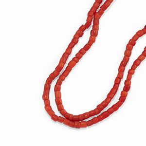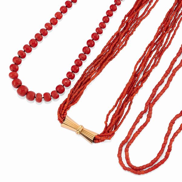 una realizzata a sette fili con chiusura a fiocco, una a barilotti sfaccettati disposti in gradazione con chiusura rettangolare e una con piccoli barilotti lisci con chiusura trattenente corallo taglio ovale cabochon.