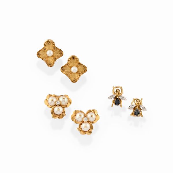 perle coltivate, diamanti taglio brillante e huit-huit e zaffiri taglio goccia, chiusure a clip.