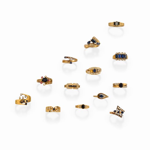 di varie forme e decori con zaffiri taglio ovale, navette, carré e rettangolare, diamanti, rubini, micro perle e pietra gialla.