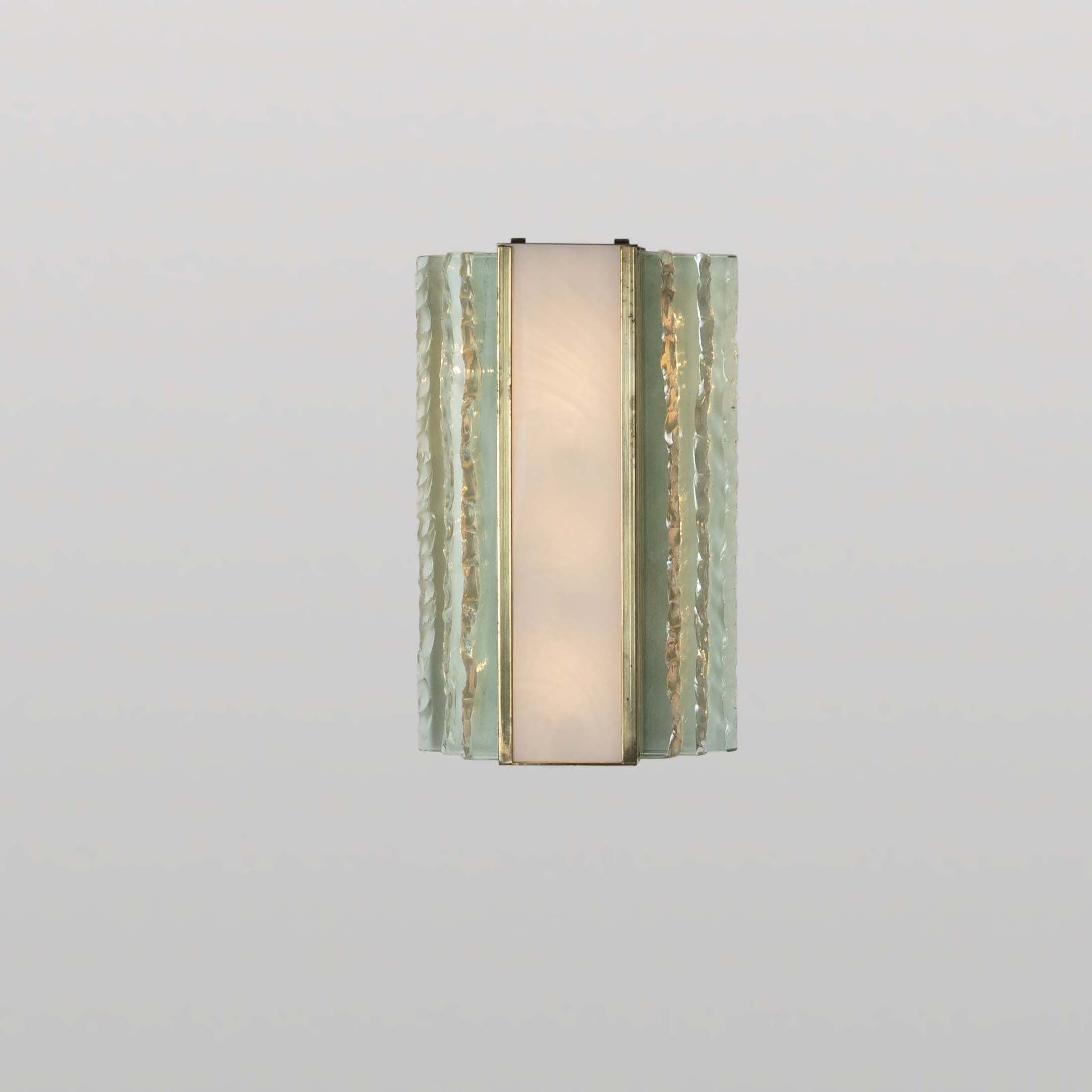 Struttura in ottone e diffusori in vetro scalpellato di forte spessore e vetro satinato.