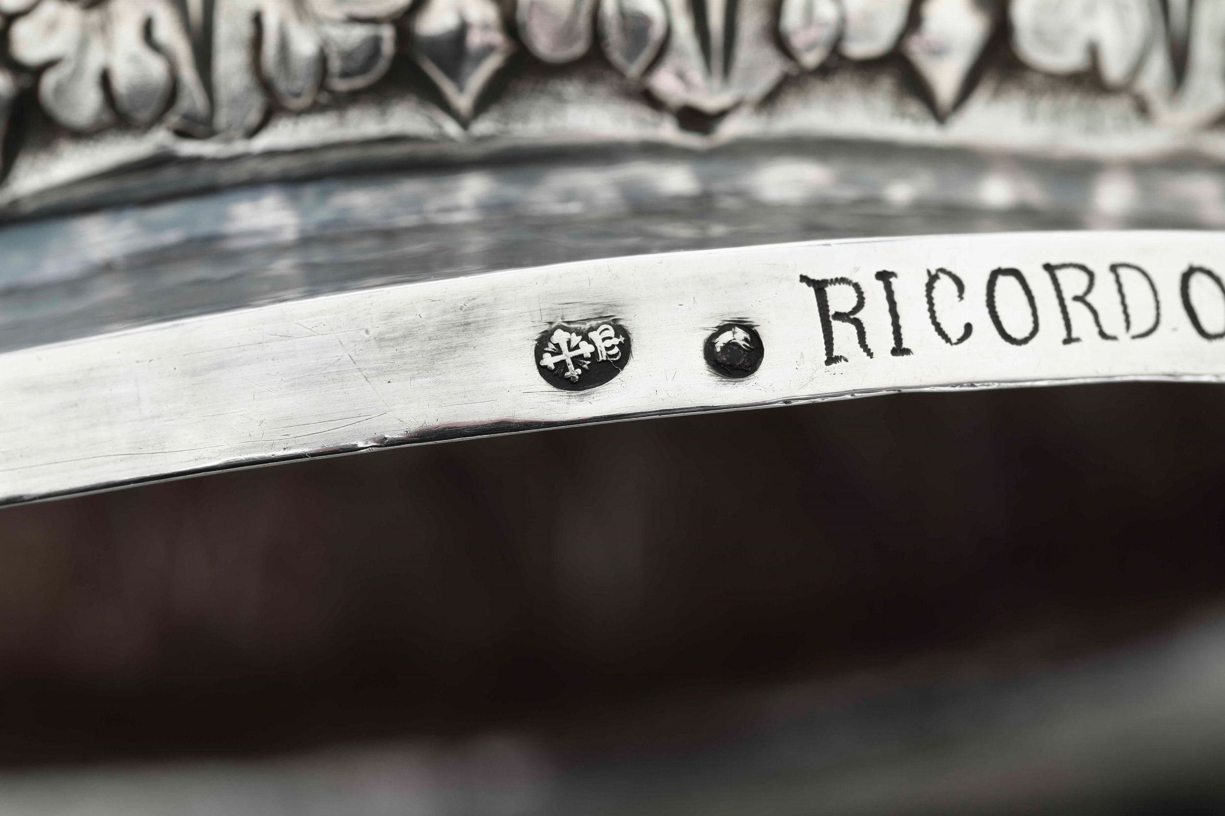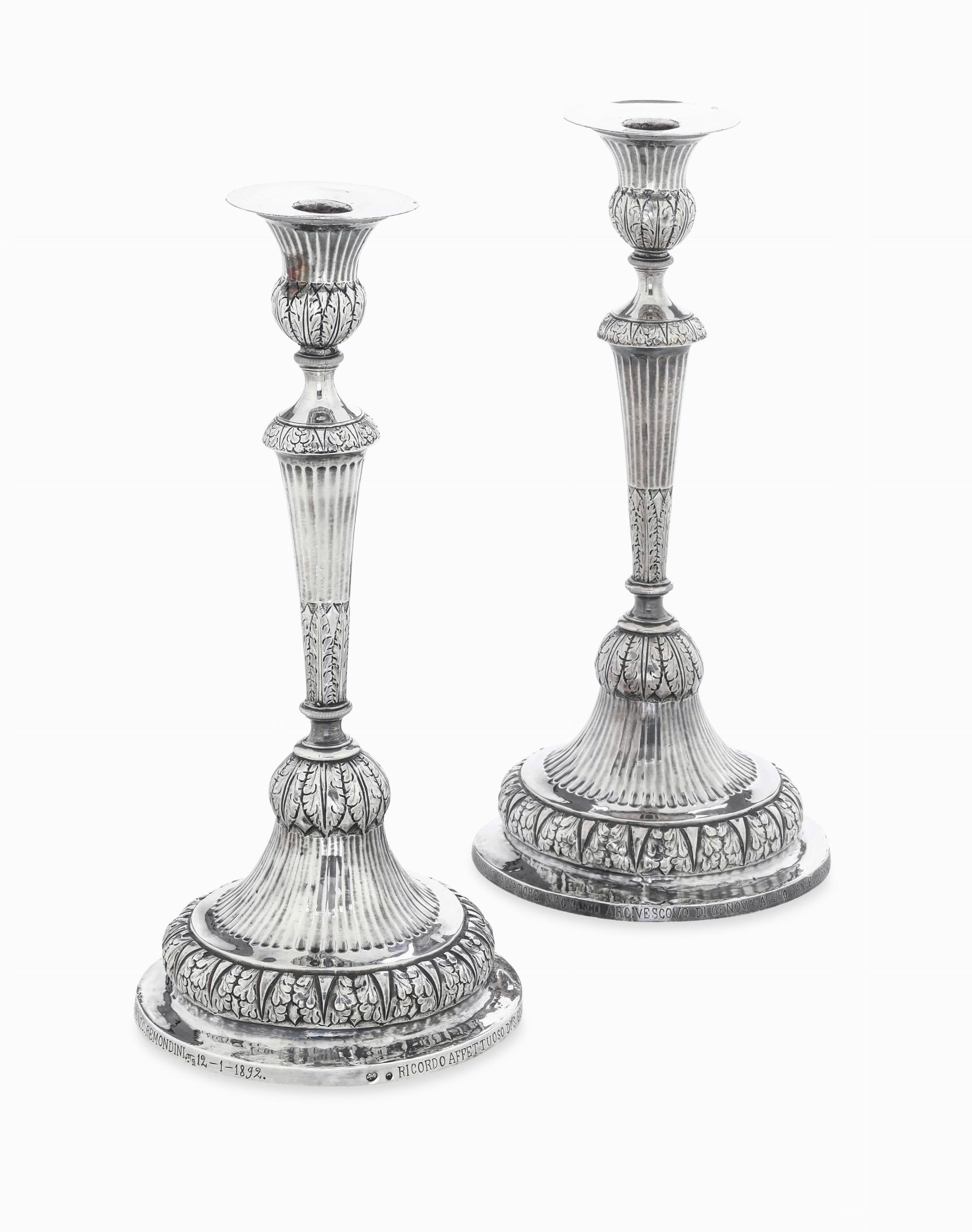Coppia di candelieri. Genova, 1819. Marchio della Torretta con datario (1)819 e [..]