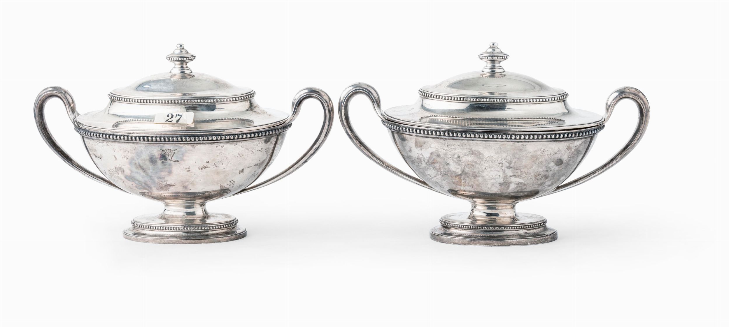 Coppia di zuppiere. Argento fuso e sagomato. Una con bollo della città di Londra [..]