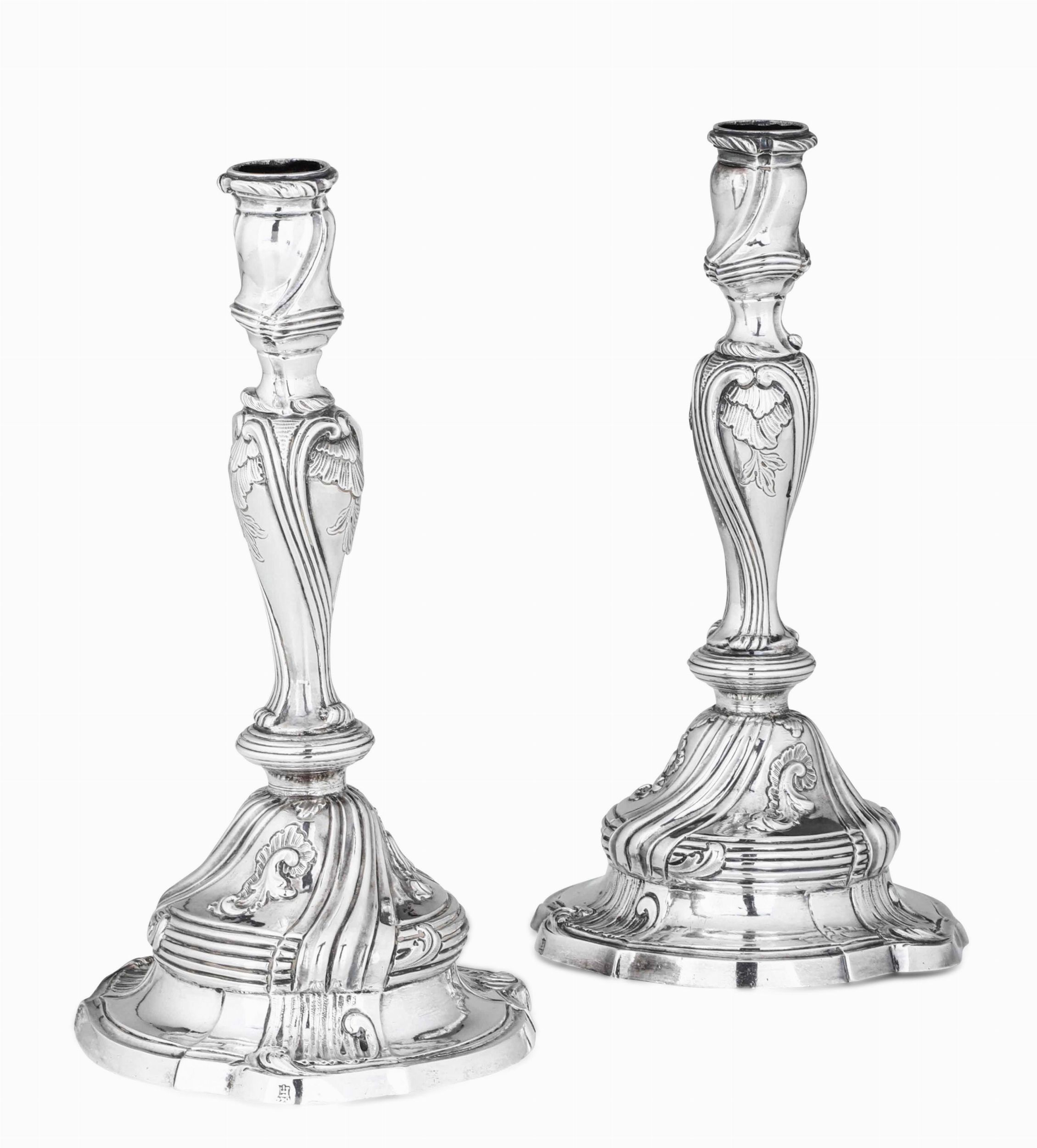 Coppia di candelieri in argento fuso sbalzato e cesellato. Genova, marchio della [..]