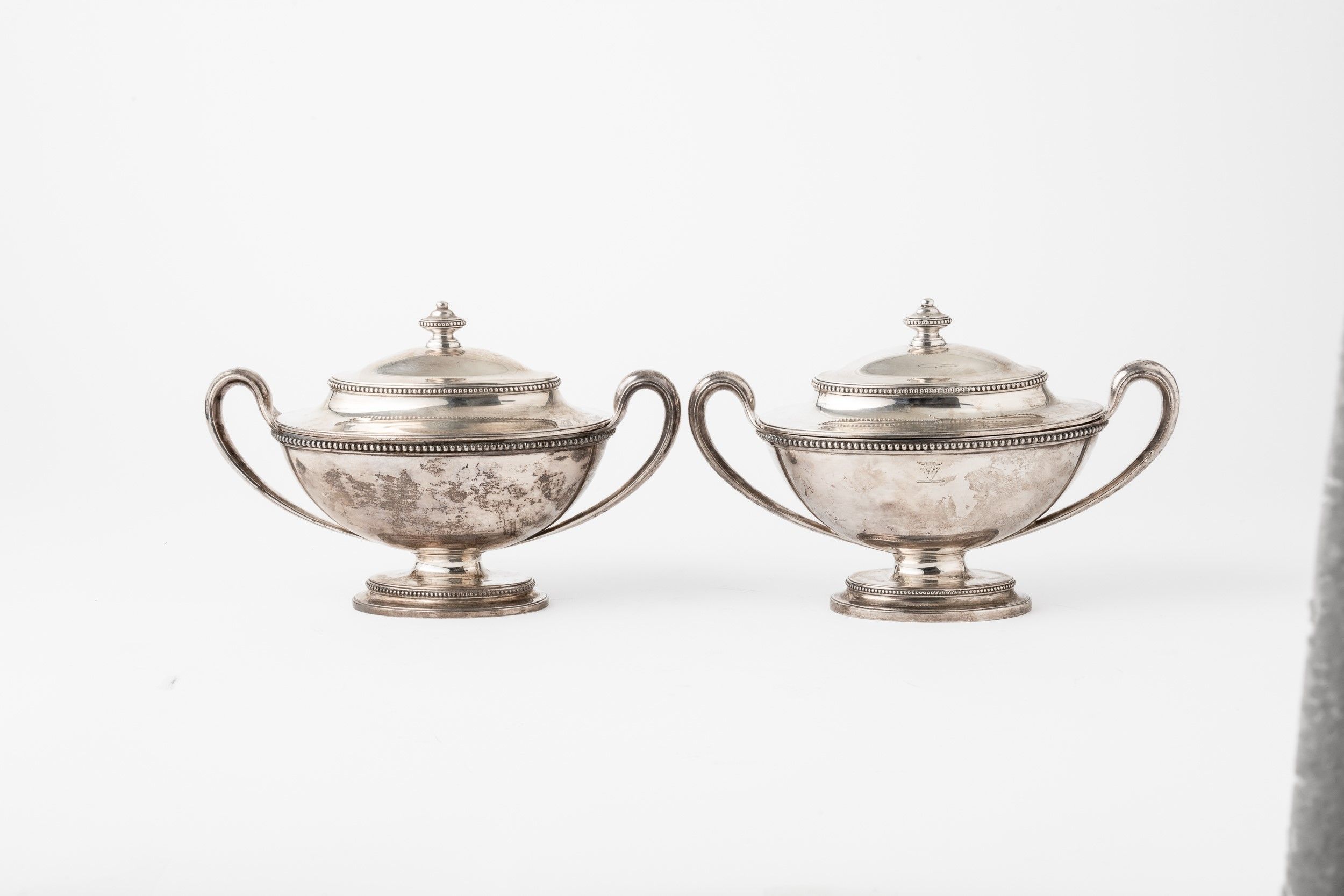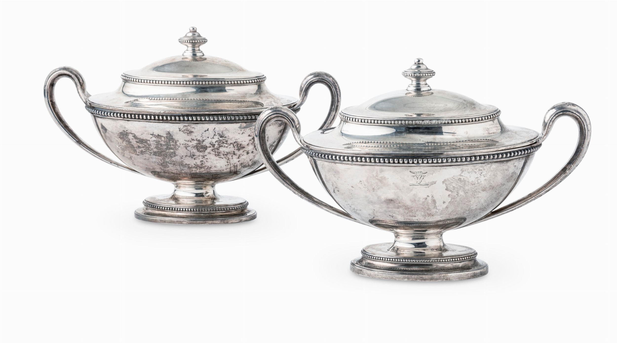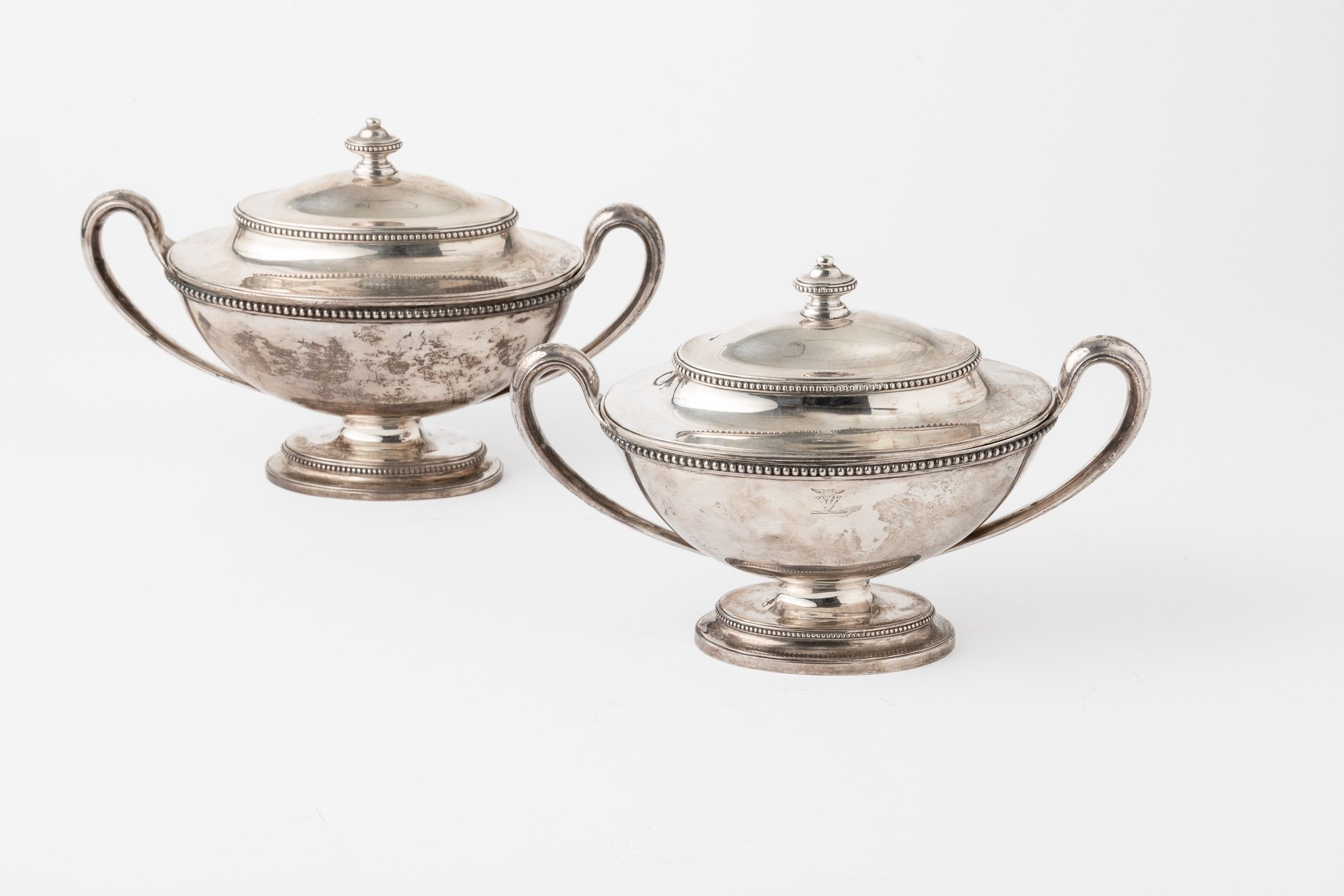 Coppia di zuppiere. Argento fuso e sagomato. Una con bollo della città di Londra [..]