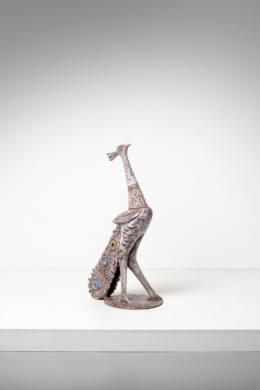 Scultura in ceramica dipinta e smaltata raffigurante un pavone, anni 50. Presente la firma fotto la base 'MITRI- VENEZIA-ITALY'.