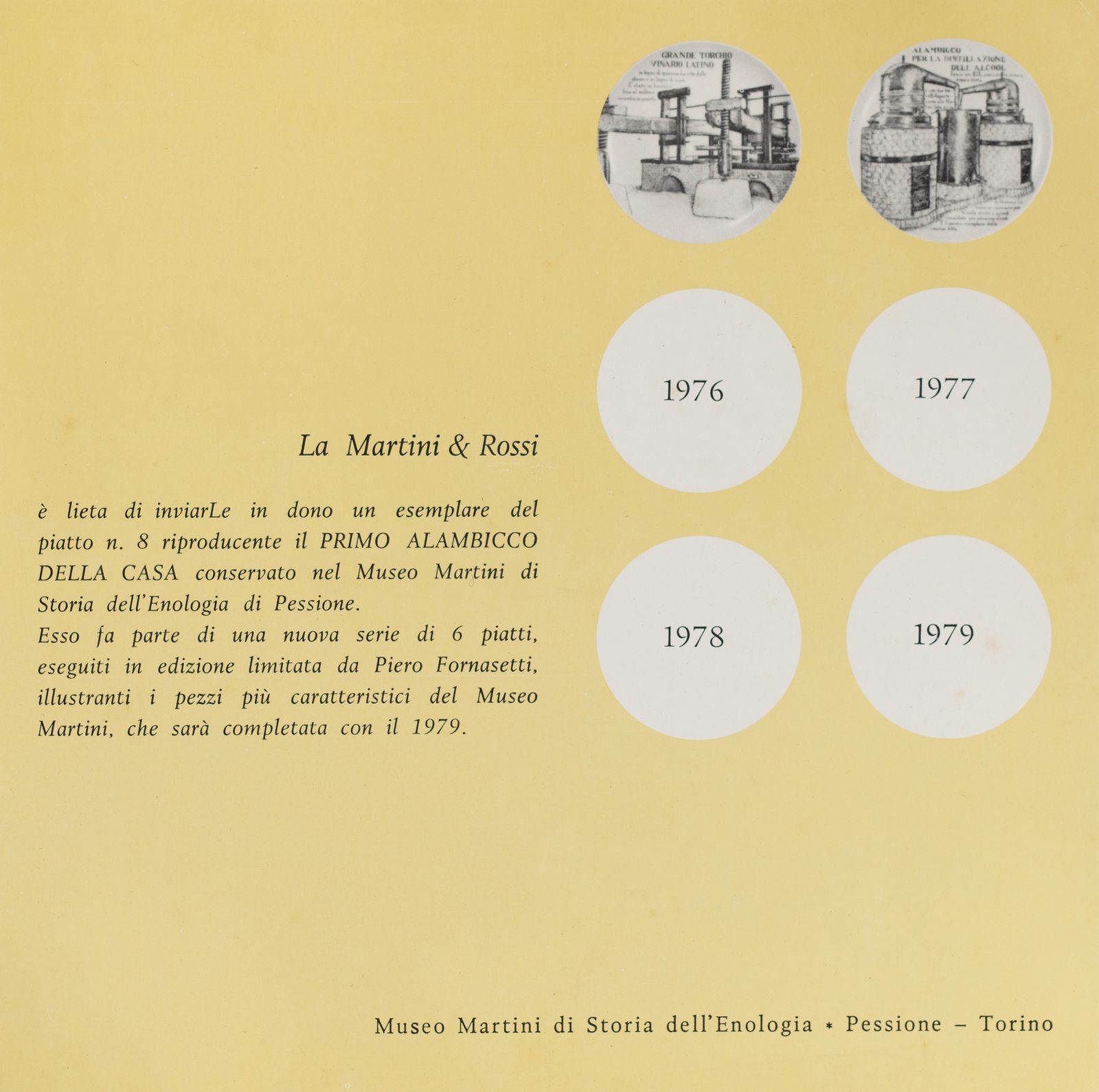 Serie di piatti creata da Piero Fornasetti per la Martini & Rossi di Torino, ispirata ai pezzi maggiori del suo Museo di Pessione. Marchio al retro, anni Sessanta.