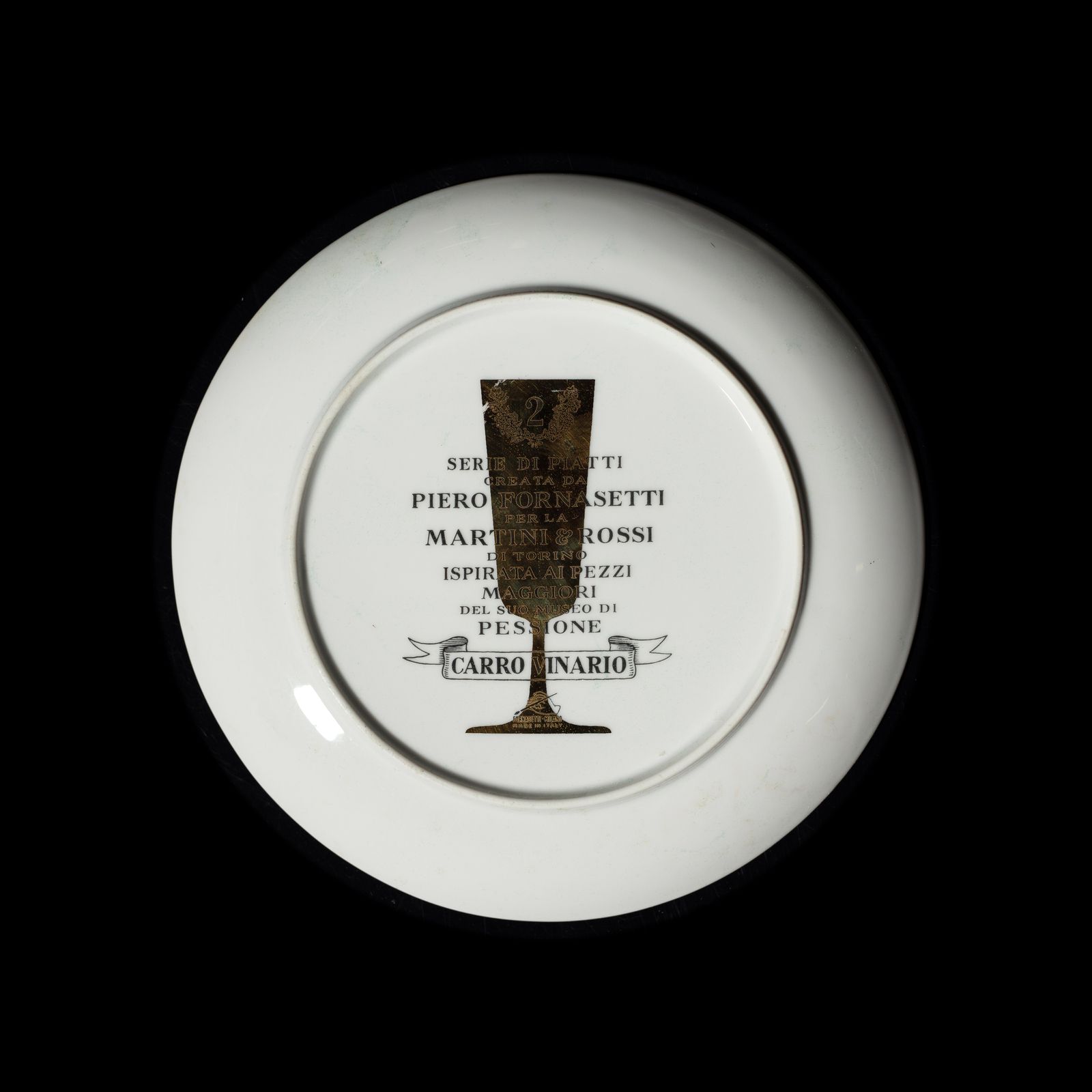 Serie di piatti creata da Piero Fornasetti per la Martini & Rossi di Torino, ispirata ai pezzi maggiori del suo Museo di Pessione. Marchio al retro, anni Sessanta.
