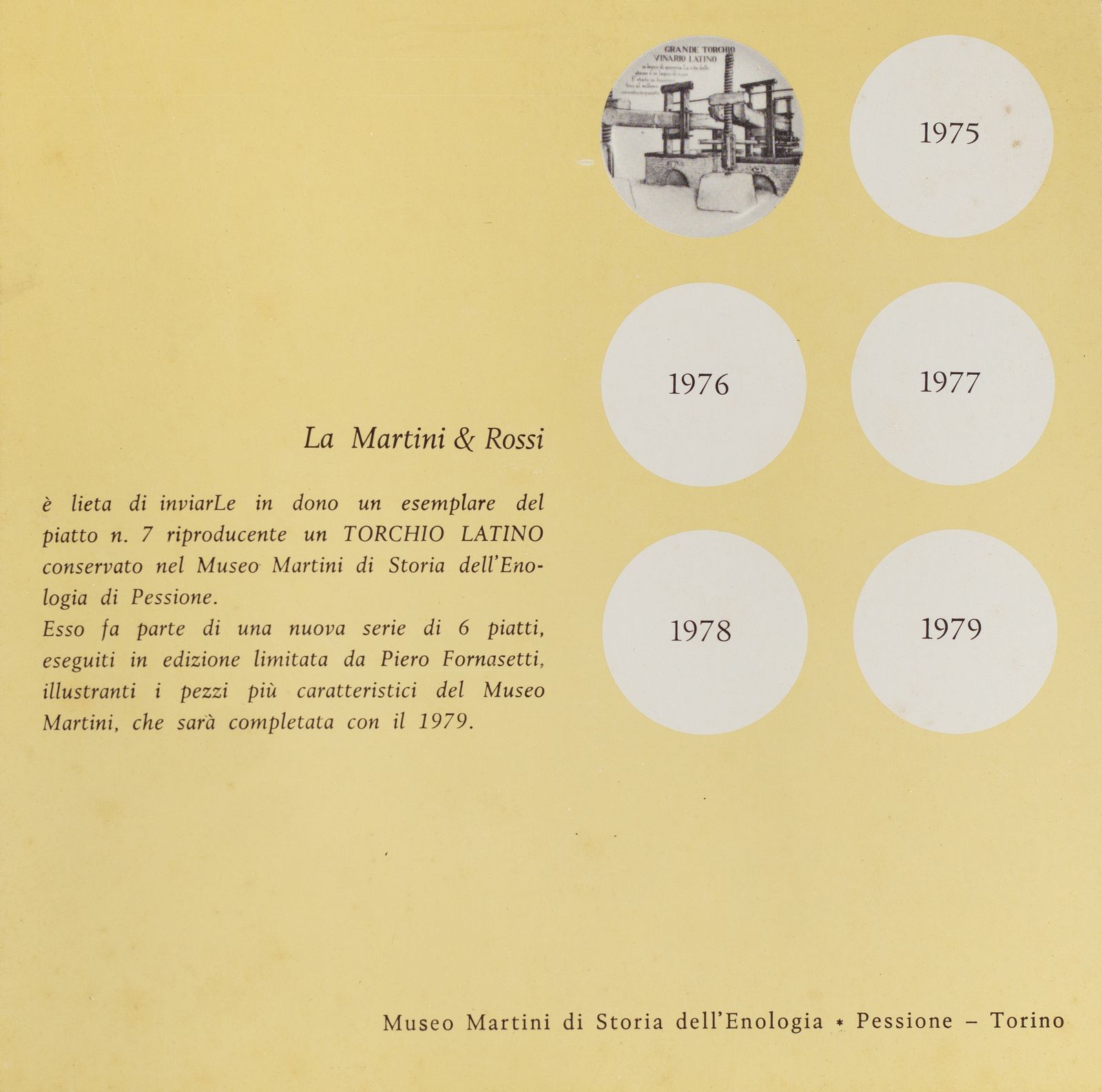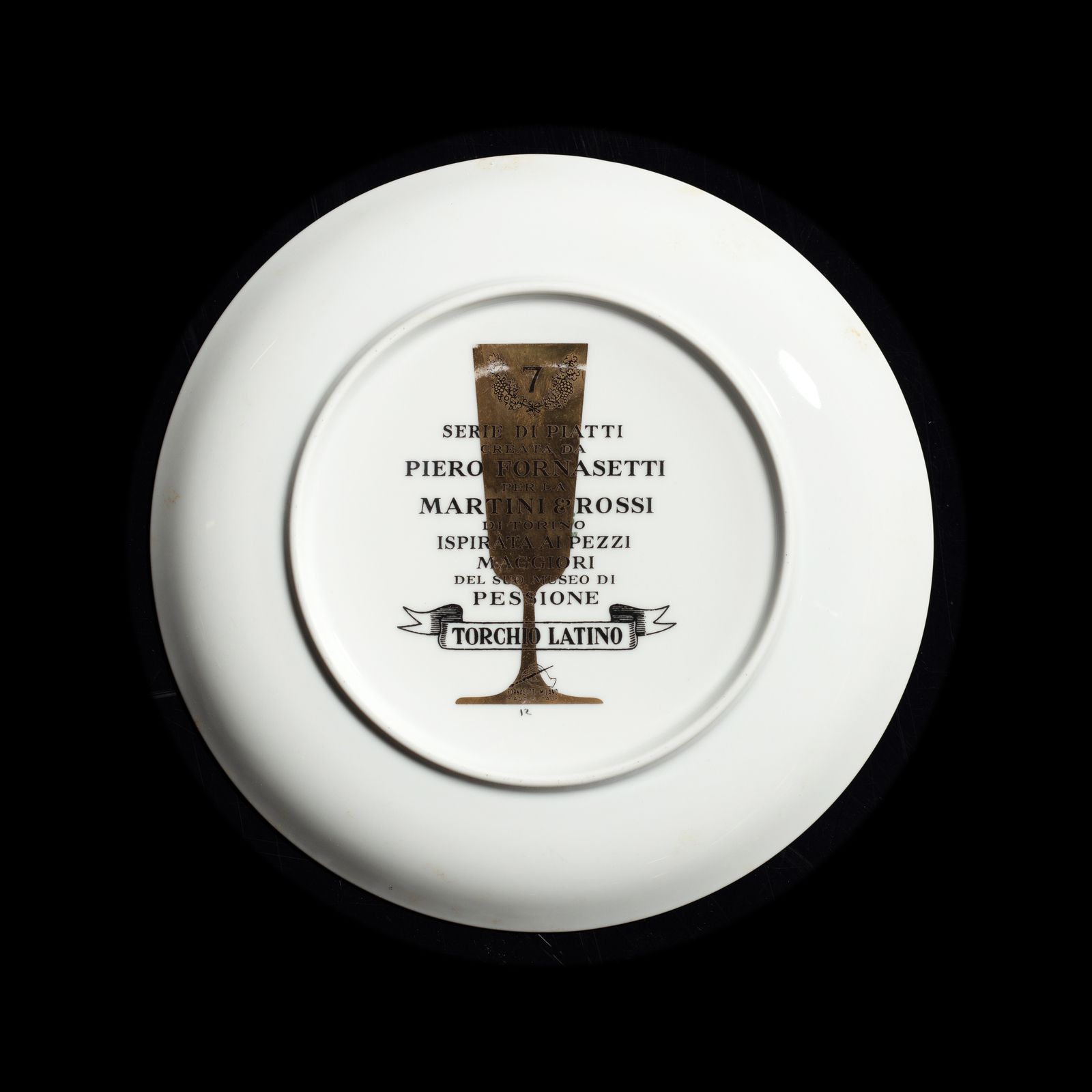 Serie di piatti creata da Piero Fornasetti per la Martini & Rossi di Torino, ispirata ai pezzi maggiori del suo Museo di Pessione. Marchio al retro, anni Sessanta.