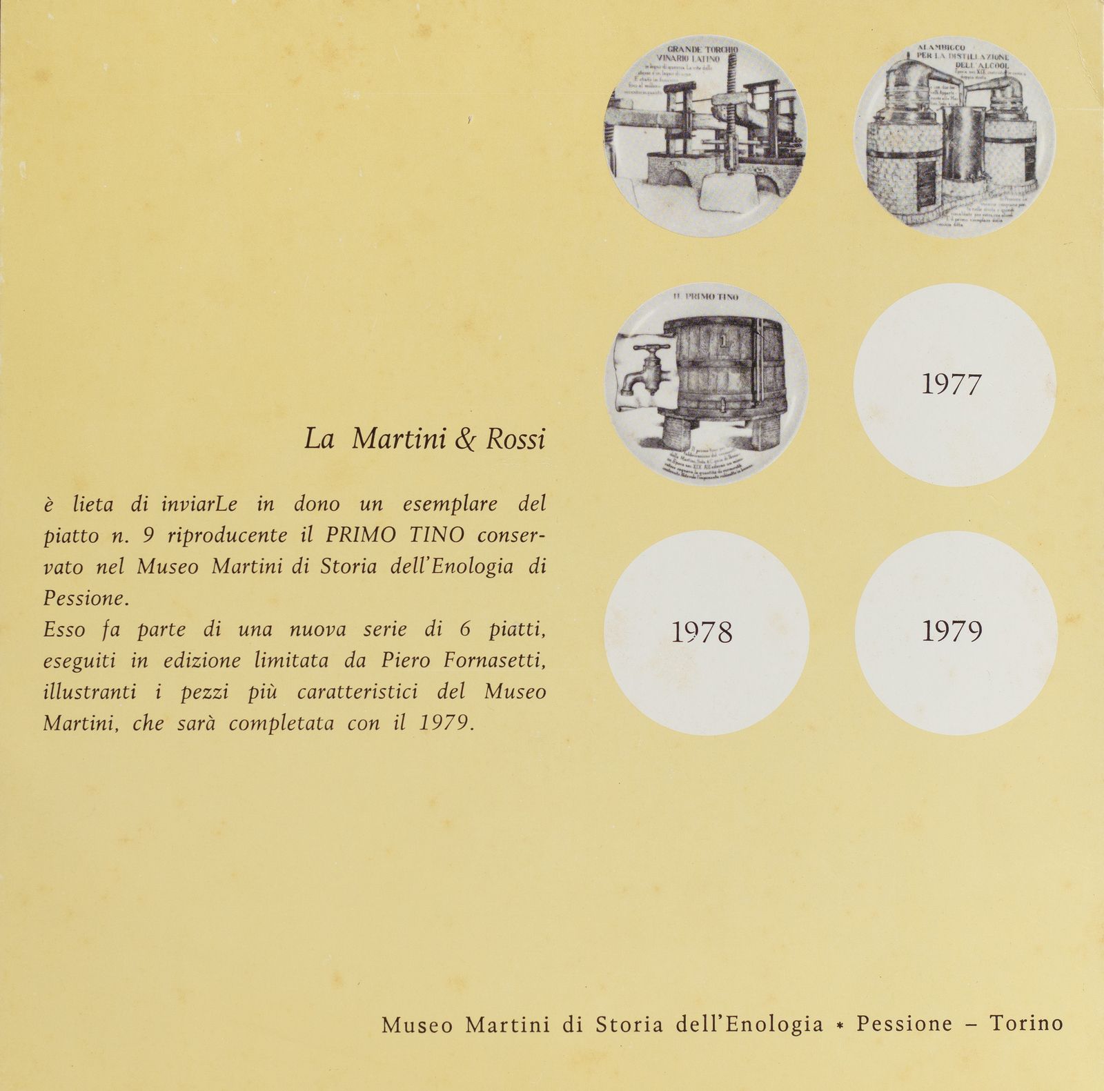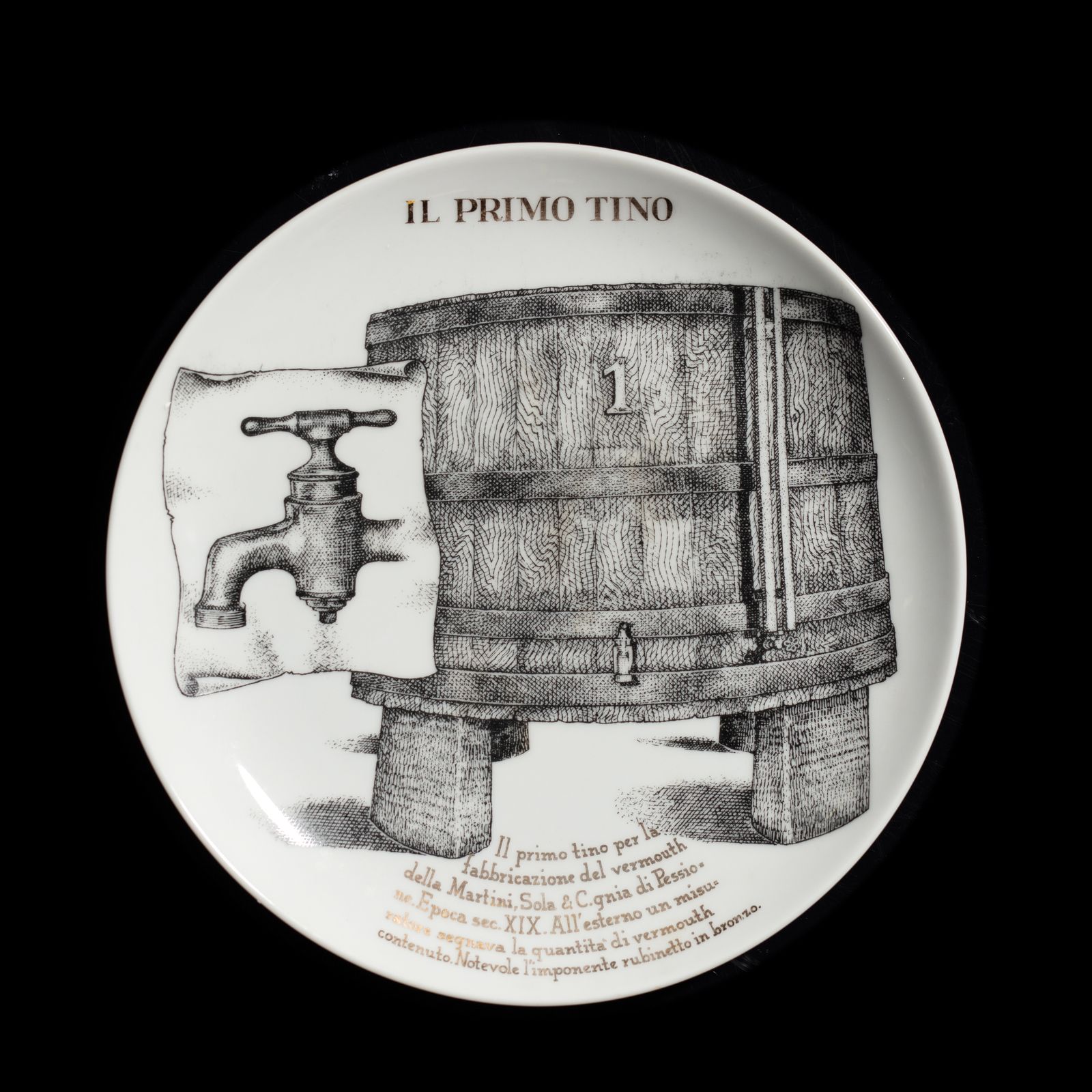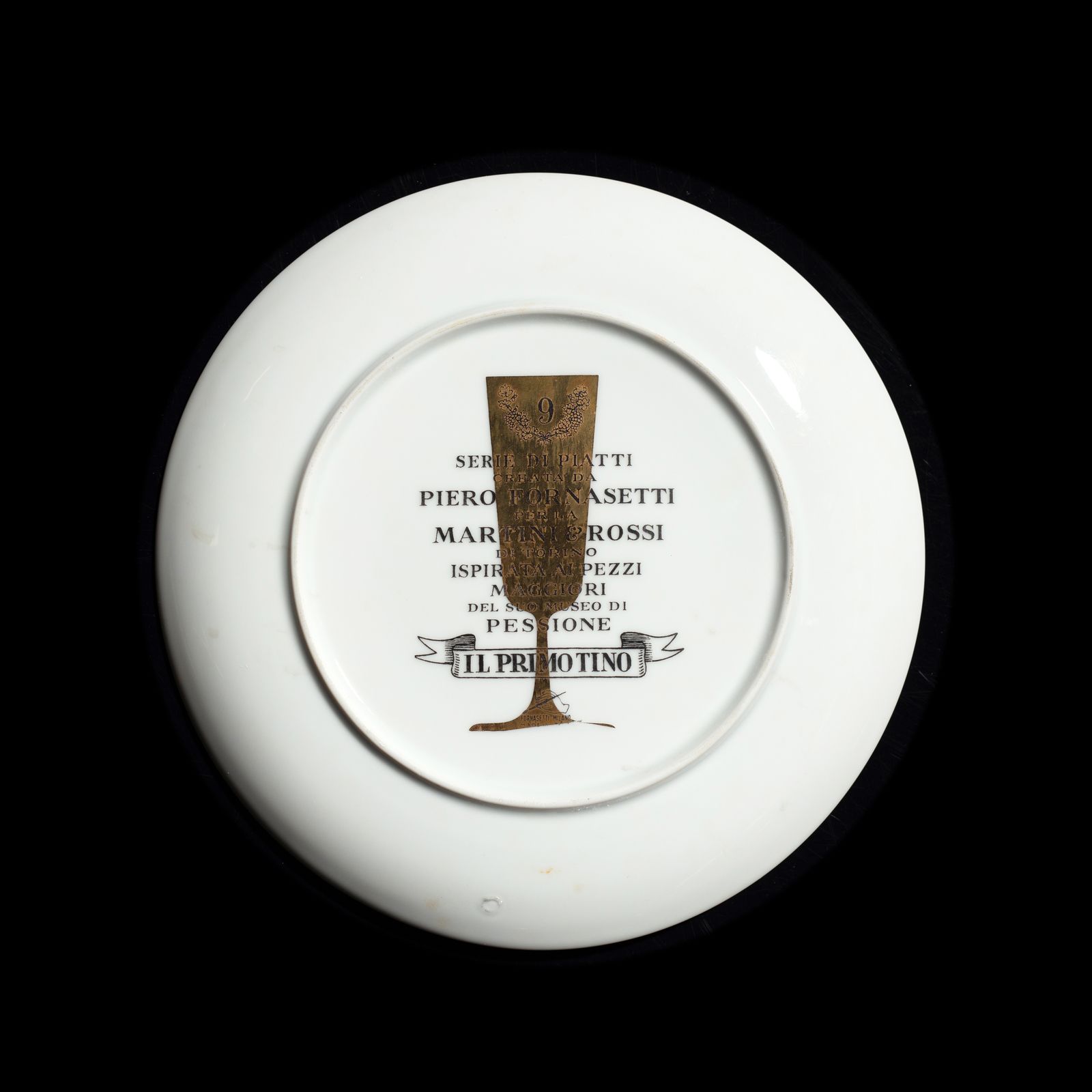 Serie di piatti creata da Piero Fornasetti per la Martini & Rossi di Torino, ispirata ai pezzi maggiori del suo Museo di Pessione. Marchio al retro, anni Sessanta.