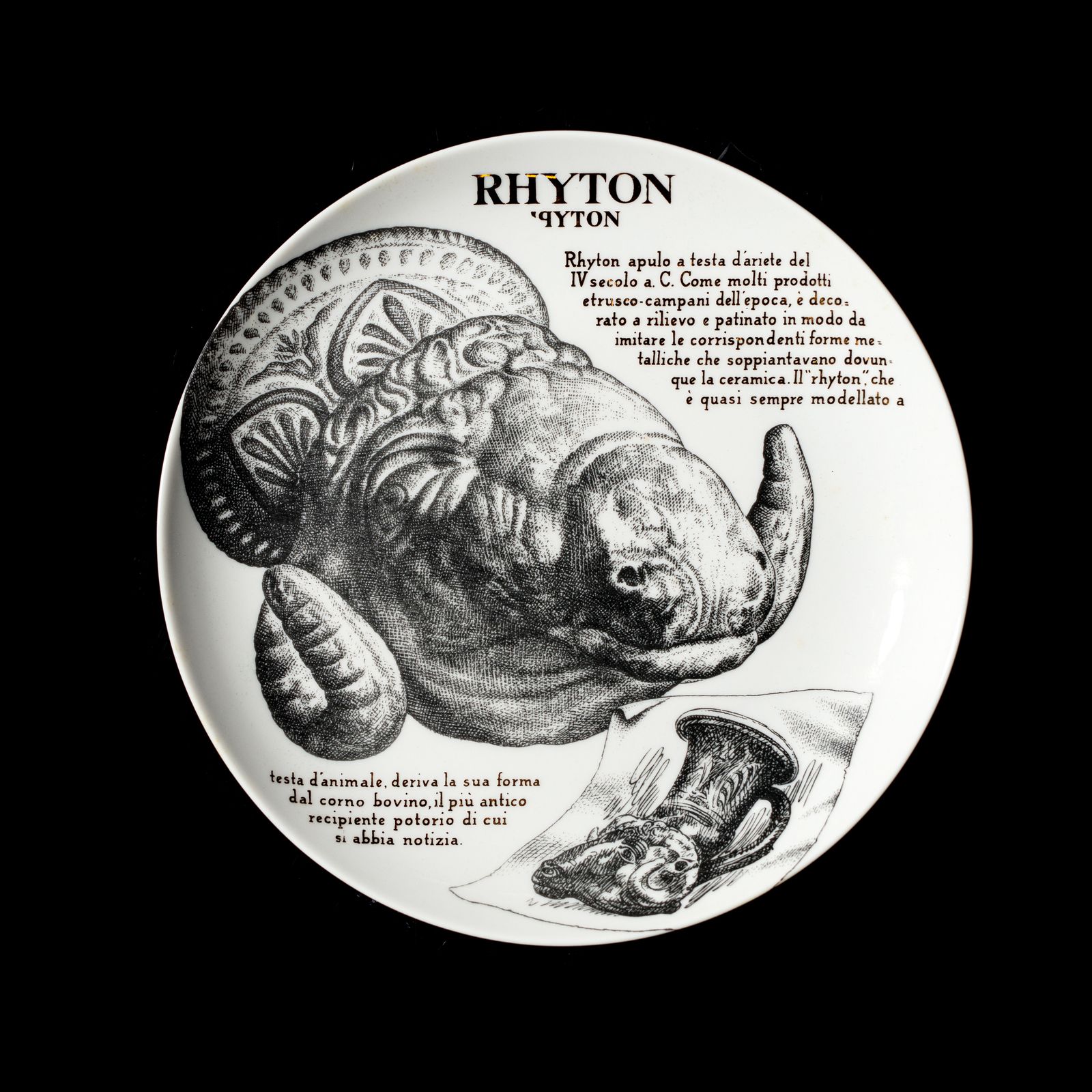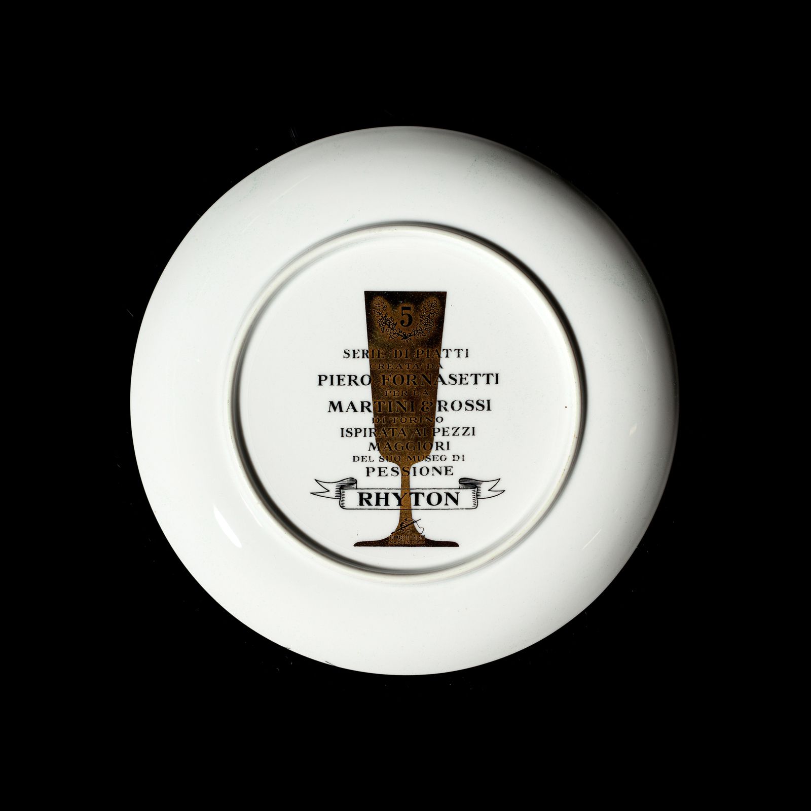 Serie di piatti creata da Piero Fornasetti per la Martini & Rossi di Torino, ispirata ai pezzi maggiori del suo Museo di Pessione. Marchio al retro, anni Sessanta.
