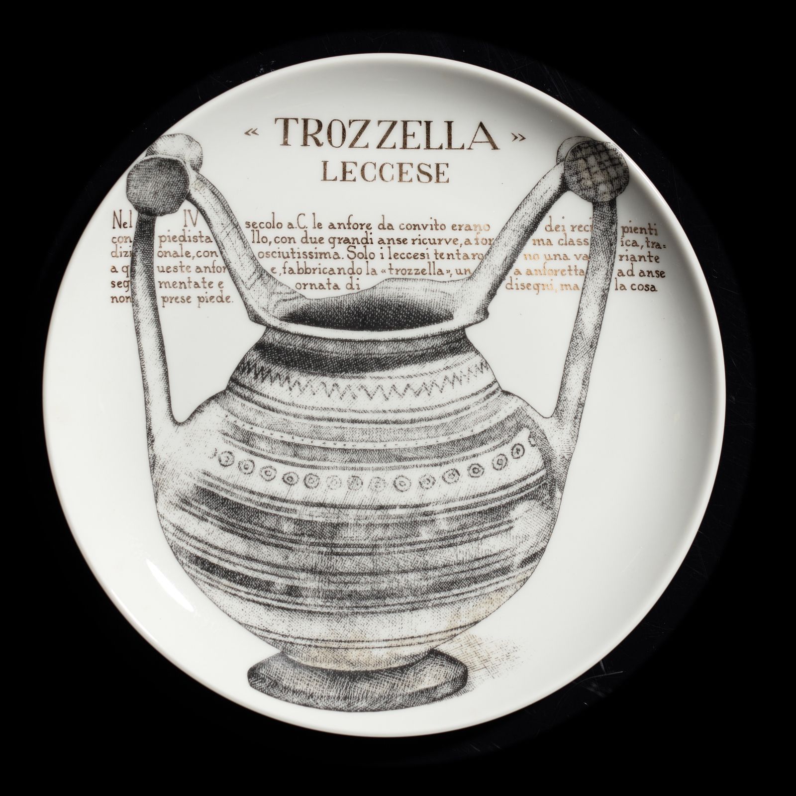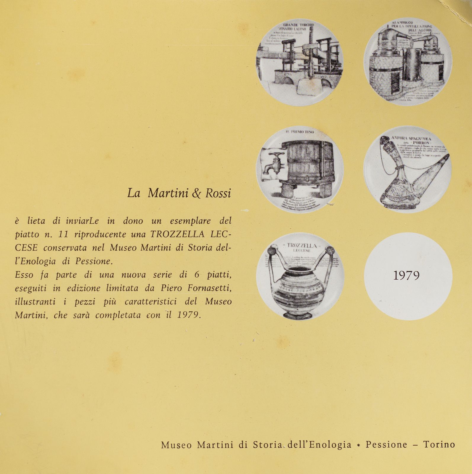 Serie di piatti creata da Piero Fornasetti per la Martini & Rossi di Torino, ispirata ai pezzi maggiori del suo Museo di Pessione. Marchio al retro, anni Sessanta.