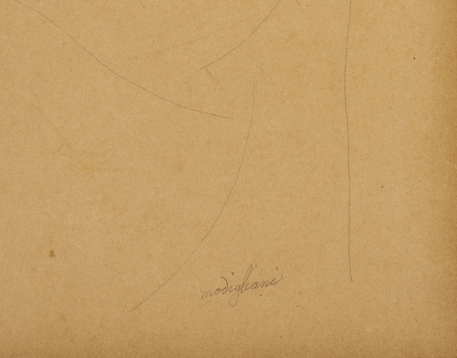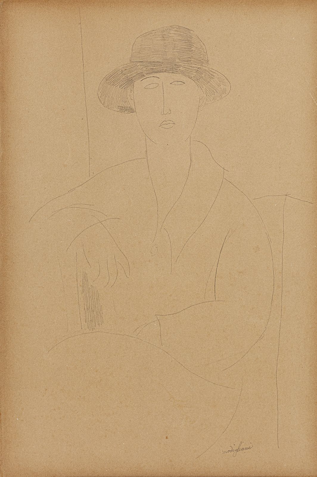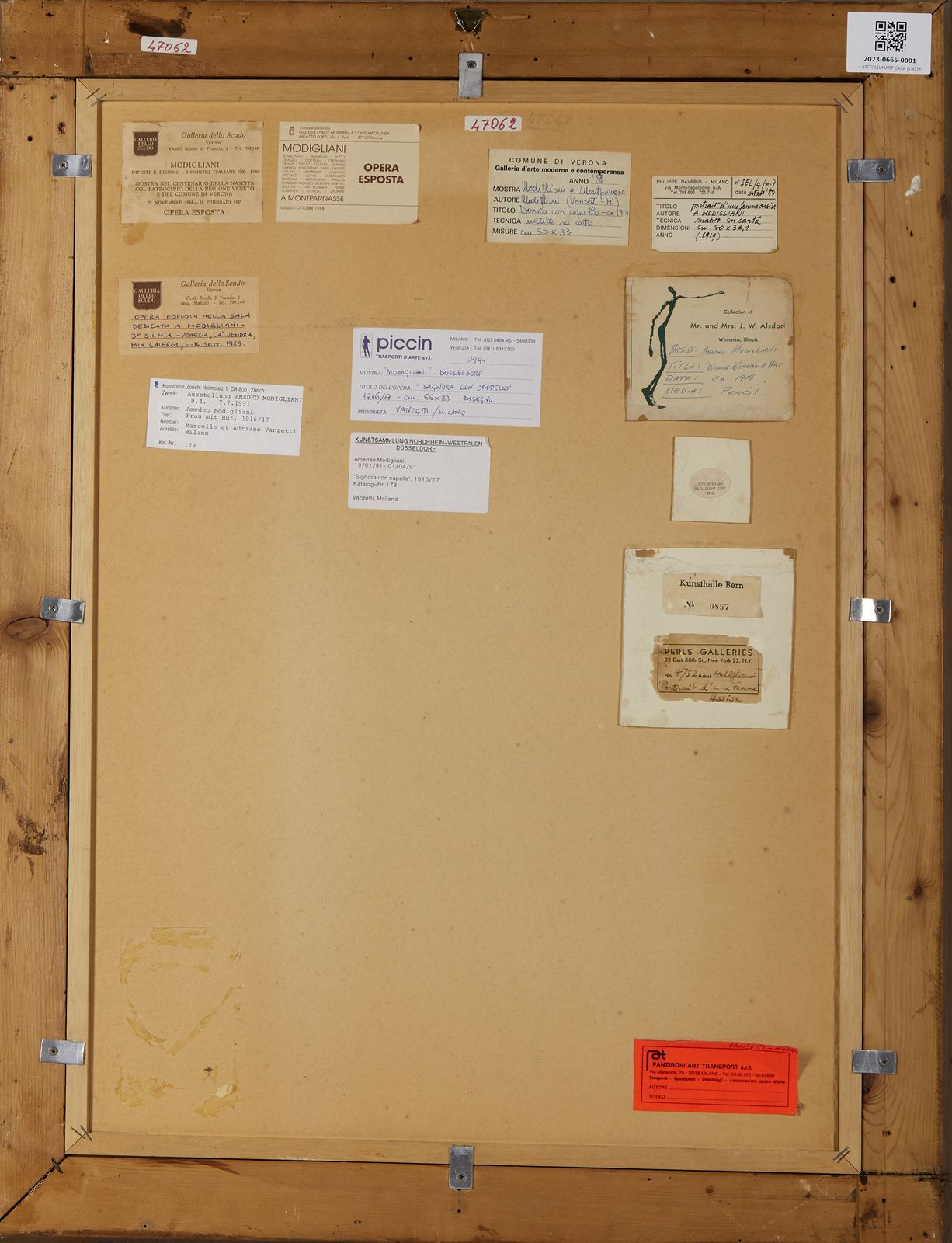 Firma in basso a destra a matita. Al retro cartigli descrittivi Galleria dello Scudo, Verona. Galleria d'Arte Moderna e Contemporanea Palazzo Forti, Verona. Kunsthaus Zurich, Zurigo. Piccin Trasporti d'Arte, Milano/Venezia. Kunstsammlung Nordrhein-Westfalen, Dusseldorf. Philippe Daverio, Milano. Collezione Mr and Mrs Alsdorf, Winnetka, Illinois. Kunsthalle Bern. Perls Galleries, New York. Certificato di provenienza Philippe Daverio, Milano. Pubblicazioni: Amedeo Modigliani catalogo generale dei disegni 1906-1920 a cura di Osvaldo Patani, p.172 ill. 275. Patani, 1976, n.55. Patani, 1982, n.85. Selezione 4, Disegni Italiani del 900, Ed. Galleria Daverio 1980, p.24 (Signora Seduta p.7) Modigliani disegni e acquerelli, mostra Galleria Farsetti Cortina d'Ampezzo 2002 (Signora con Cappello pp.62/63). Kunsthaus Zürich. 133 Frau mit Hut, 1916/1917, n.178. Esposizioni: Philippe Daverio, Milano, 1980. Modigliani, Dipinti e Disegni. Incontri Italiani 1900-1920, Galleria dello Scudo, Verona, 25 novembre 1984-16 febbraio 1985. Ca' Vendramin Calergi, Venezia, 6-16 settembre 1985. Modigliani a Montparnasse, Galleria d'Arte Moderna e Contemporanea Palazzo Forti, Verona, Luglio-ottobre 1988. Kunstsammlung Nordrhein-Westfalen, Dusseldorf, 19 gennaio-1 aprile 1991. Amedeo Modigliani, Kunsthaus Zurich, Zurigo, 19 aprile-7 luglio 1991. Chicago 1955 n.26. Torino 1985 n.46. Milano 1988-1989 n. 75. Dusseldorf - Zurigo 1991 n. 133. Cortina d'Ampezzo 2002 p.62/63. Provenienza: Galerie Scarlet, Parigi. Perls Galleries, New York. James W. Alsdorf Chicago. Kunsthalle, Bern. Kunsthaus, Zürich. Philippe Daverio, Milano. Galleria dello Scudo, Verona. Collezione privata. Si ringrazia la Kunsthaus, Zürich. la Kunsthalle, Bern e la Galleria dello Scudo, Verona, per aver contribuito alla stesura della scheda.